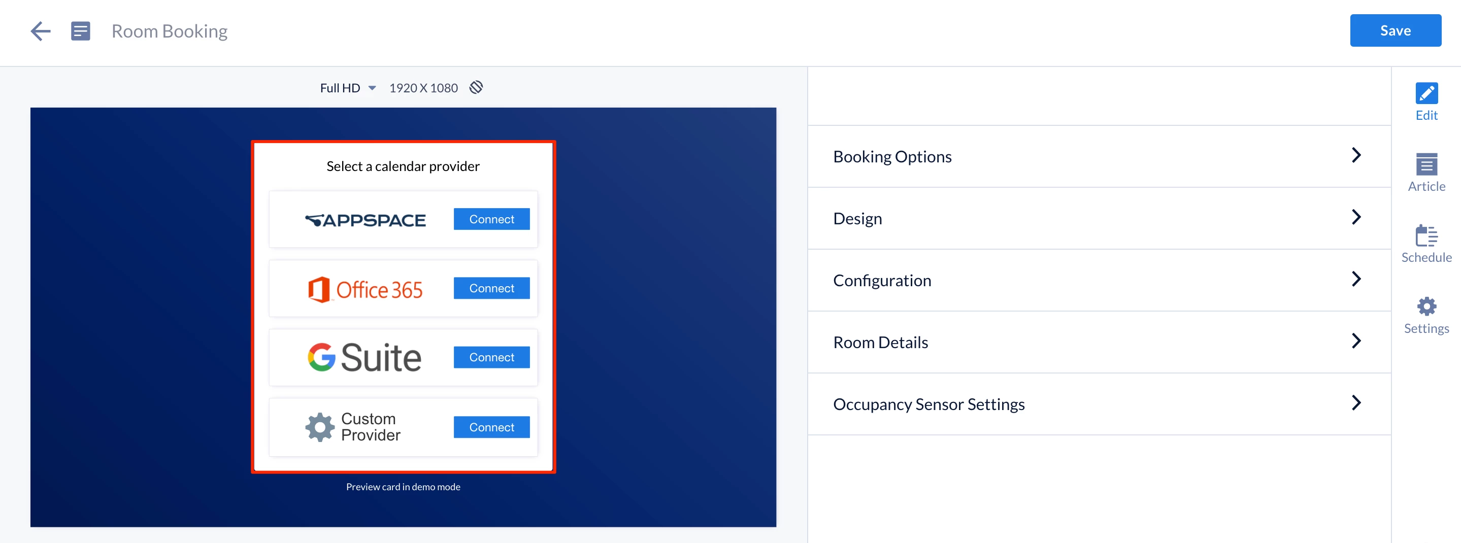 - Create a booking account, add resources, and delegate access, with your preferred calendar provider. We support Appspace Reservations, Google GSuite, Microsoft Office 365, and custom calendar providers.