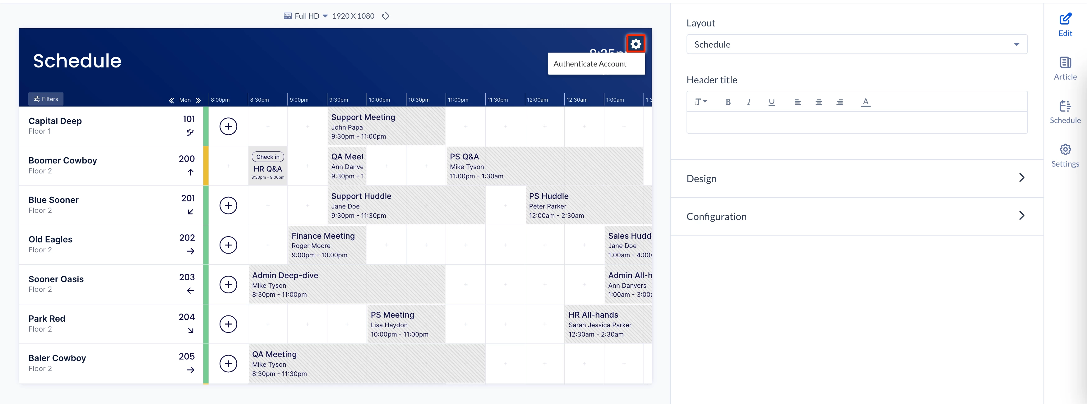 The booking status of the meeting room is only a preview, and is not indicative of the real status in this preview. If the card is in demo mode, clicking the Gear icon will display the Authenticate Account option, which will allow you to authenticate the card with your desired calendar provider.