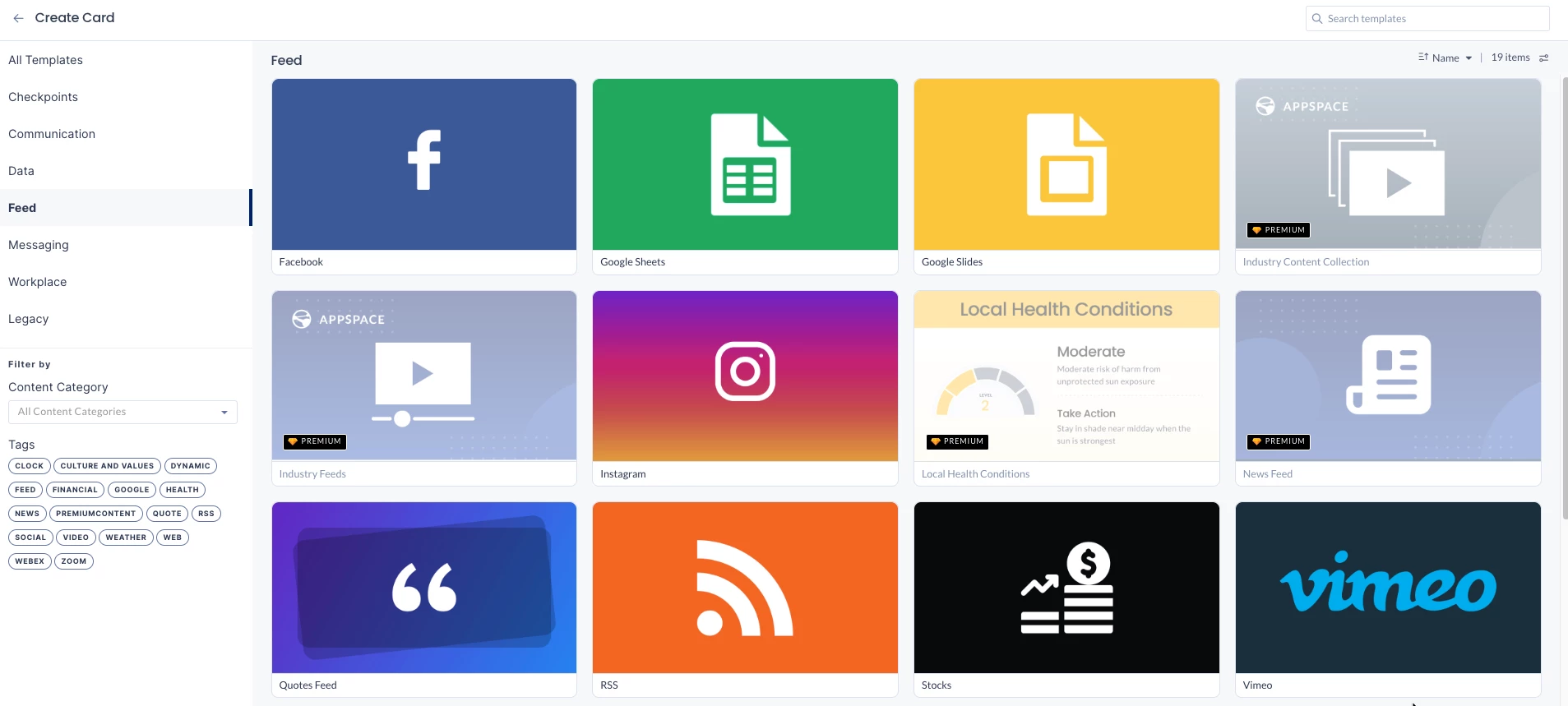 - Click Library from the ☰ Appspace menu, and click +CREATE, and select Card from template.