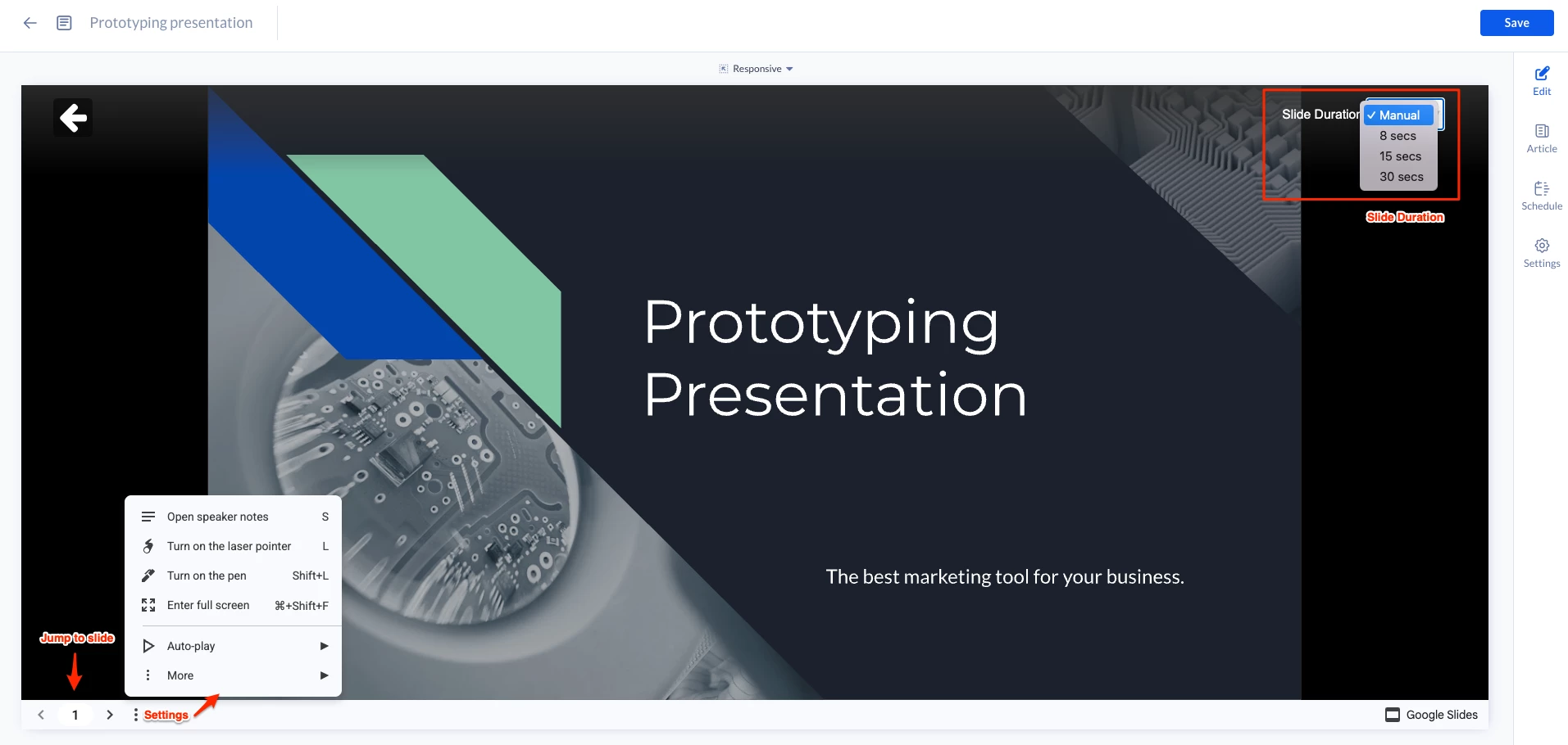 - Select the interval duration between slides. Default is set to 8 seconds. If Manual is selected, user input (such as a mouse) is required to switch the slides, use the laser pointer, and jump to a specific slide.