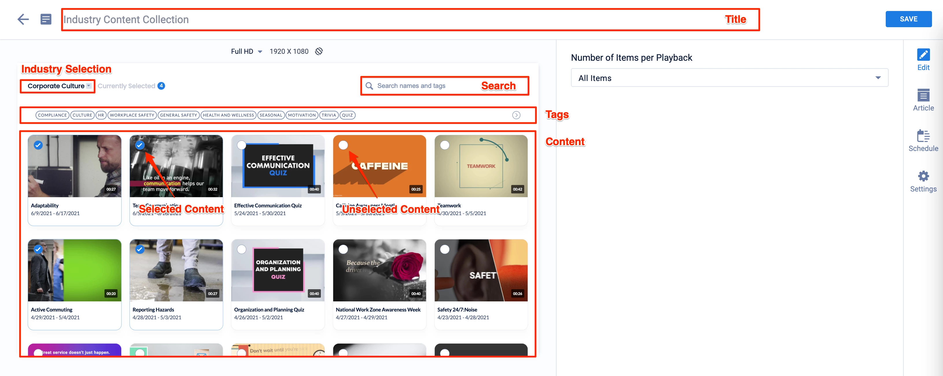 - Ability to select, search, and review content to be included in the feed quickly, as each content is easily identified by its thumbnail image, title, playback duration, and past playback schedules.