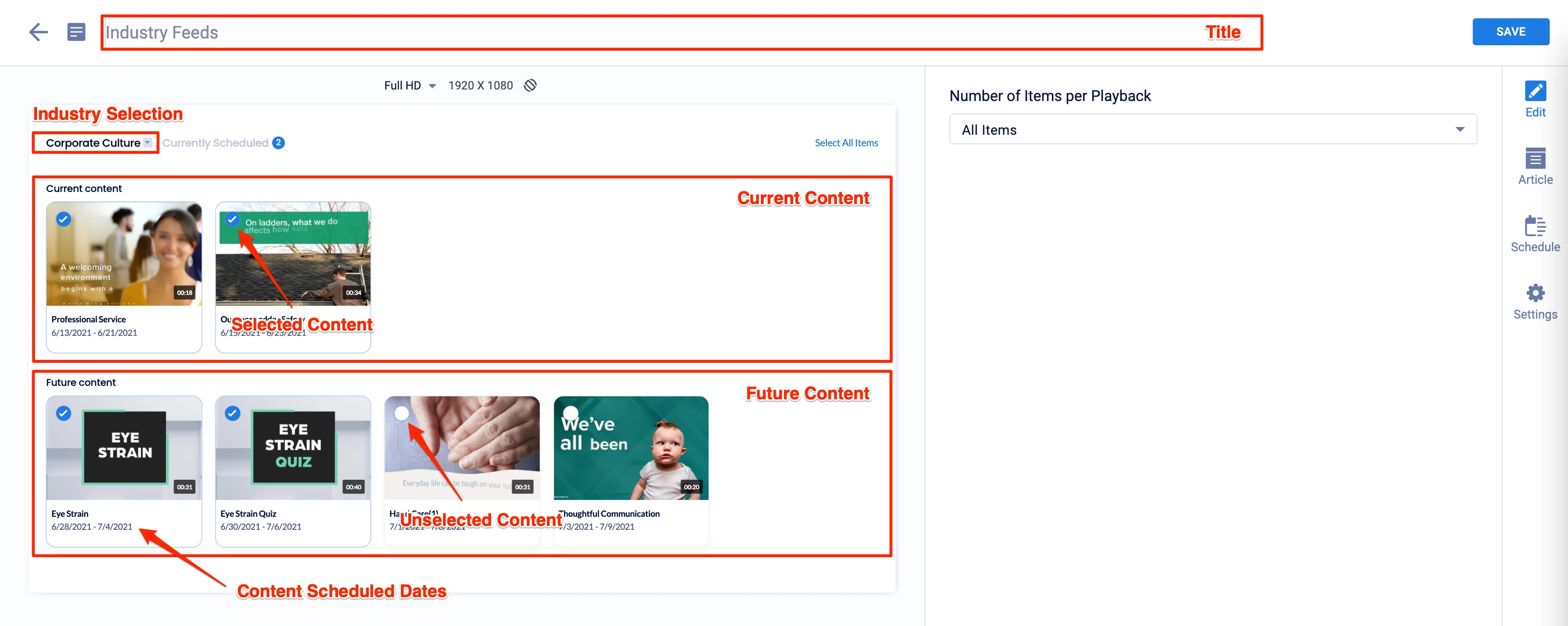 - Ability to select and review content to be included in the feed quickly, as each content is easily identified by its thumbnail image, title, playback duration, and past playback schedules.
