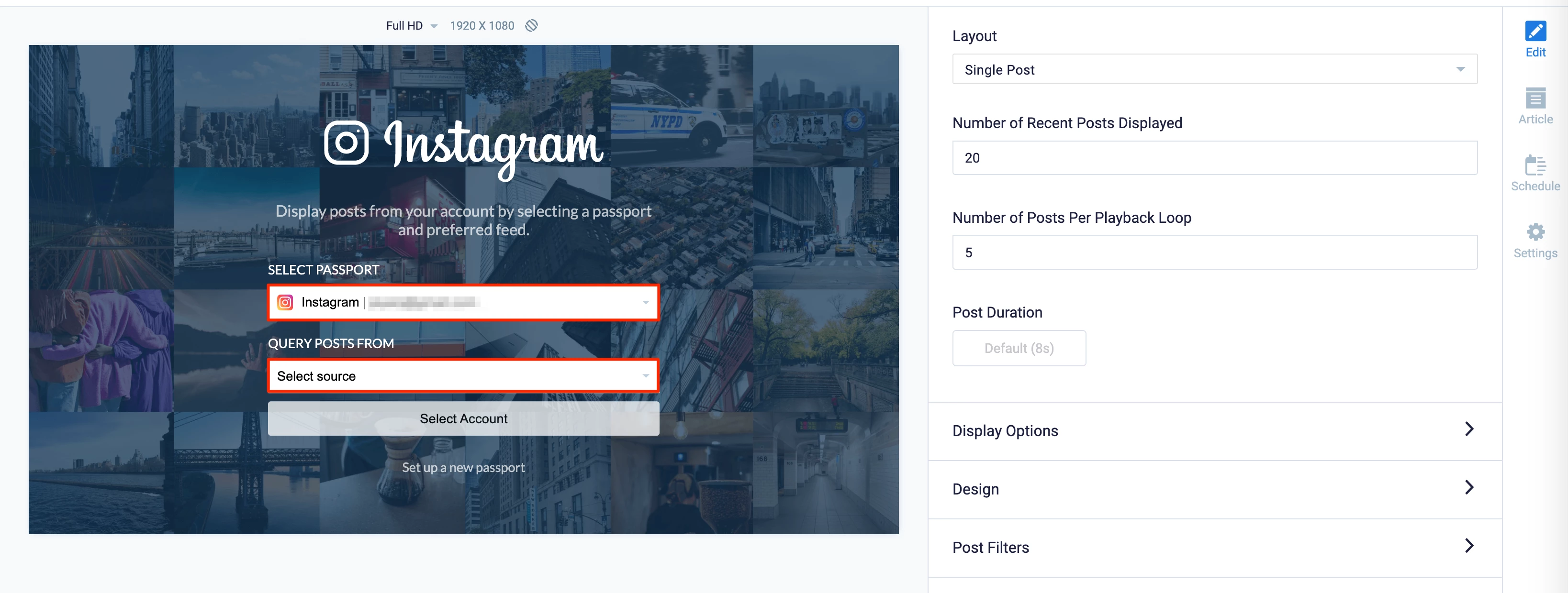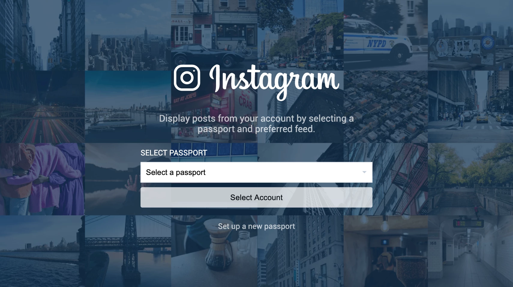 Appspace Account Owner or Publisher permissions are required. If you do not have the required permissions, you may still create the Instagram passport by clicking the Set up a new passport link when configuring the Instagram card.