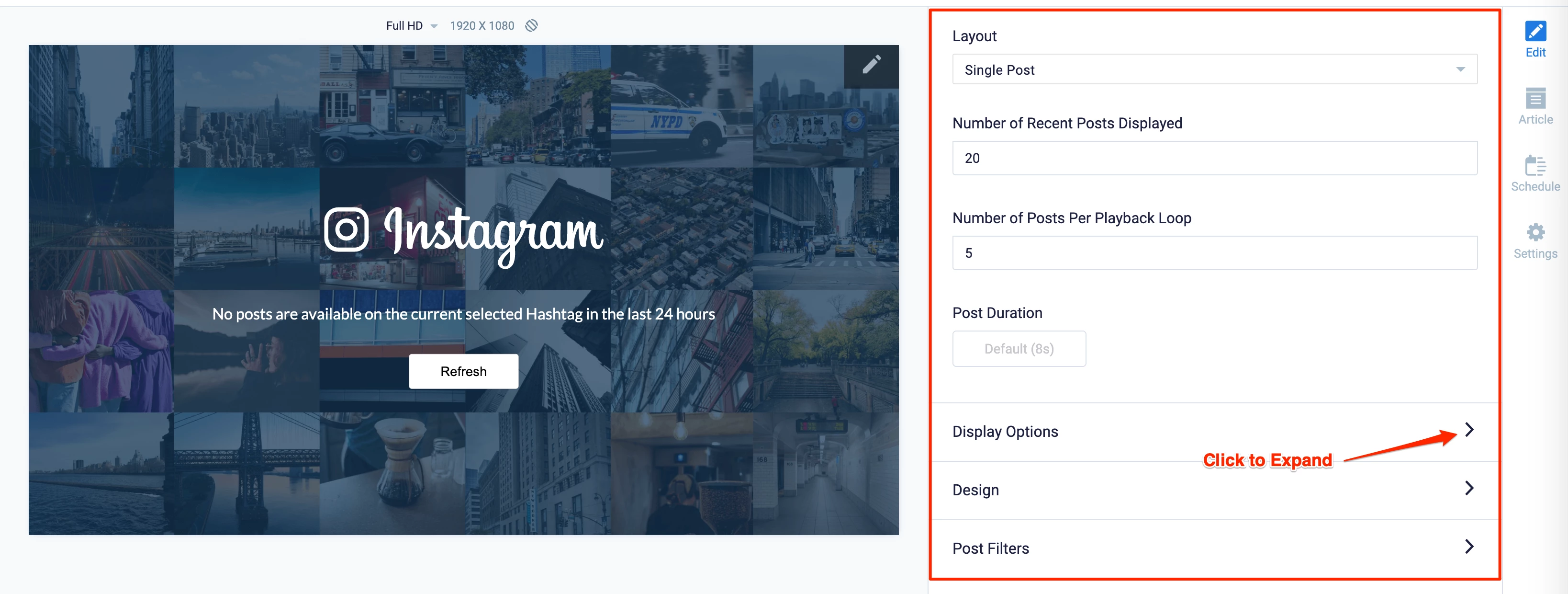- Hashtag – Enter and select the hashtag of posts to be displayed. Only posts that are made public with be displayed in the last 24 hours will be displayed.