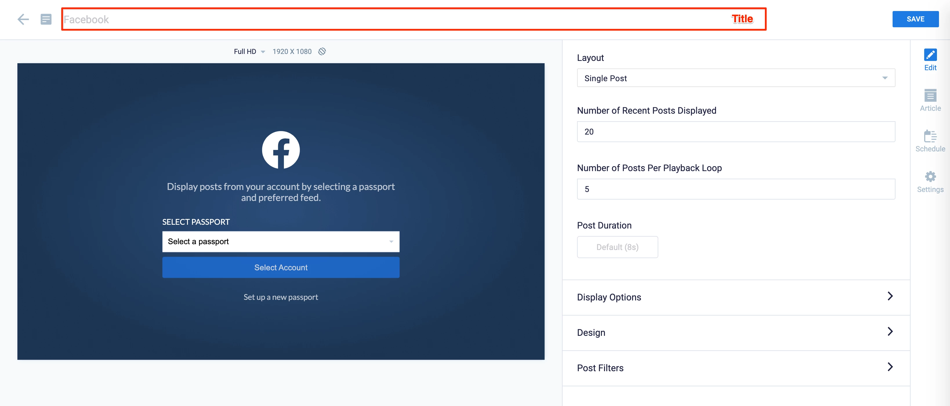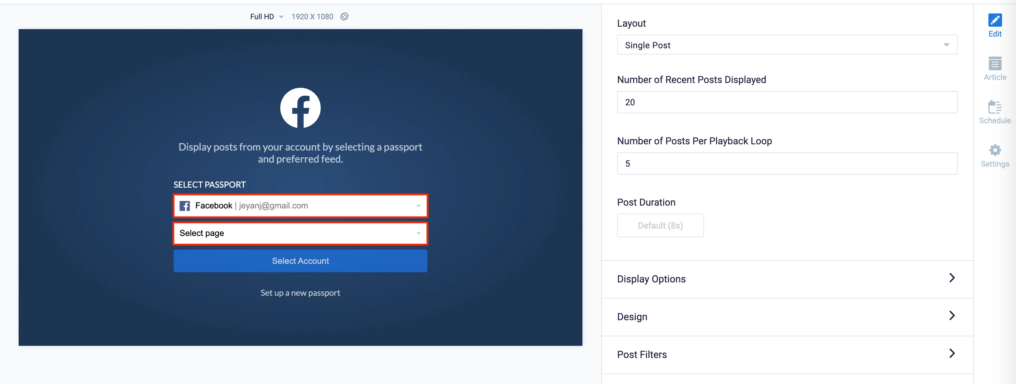 Appspace Account Owner or Publisher permissions are required. If you do not have the required permissions, you may still create the Meta Inc. passport by clicking the Set up a new passport link when configuring the Facebook card.