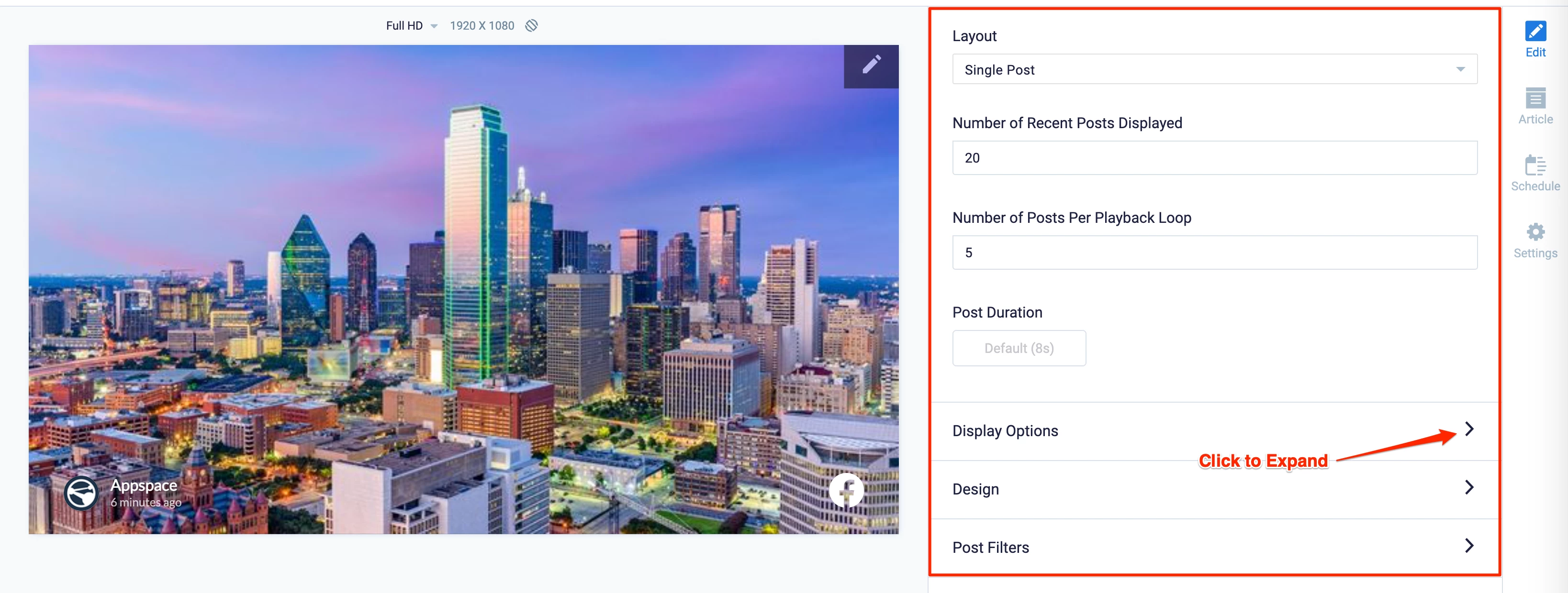 The Facebook card allows users with a Meta (previously Facebook) account to access and display Facebook posts, keeping employees engaged while increasing the organization’s social media presence. The card is built using the new Appspace integration with third-party systems that leverages standard technologies to create long-lived, authenticated, and secure connections.