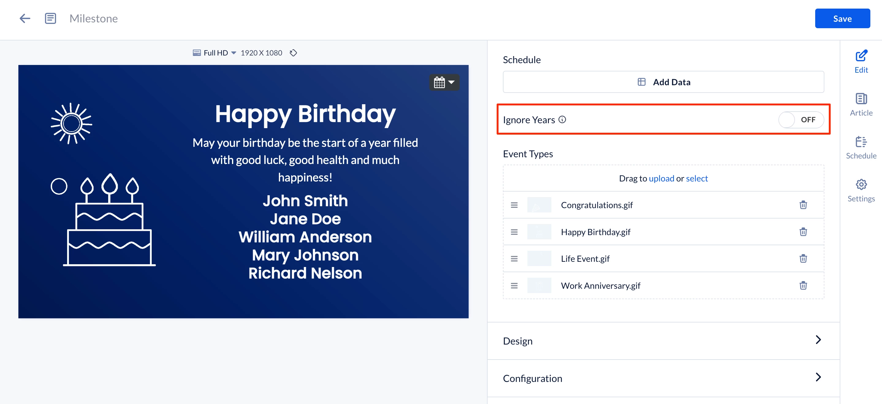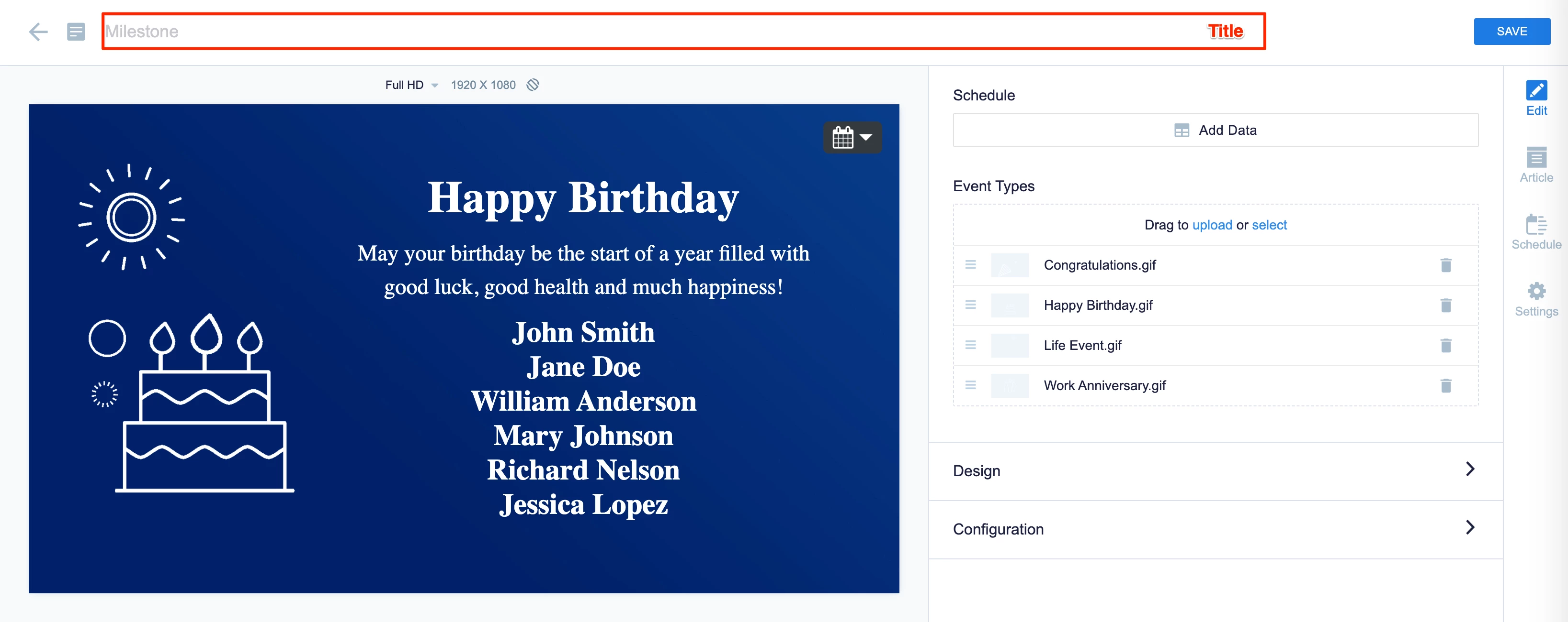 The Milestone card allows businesses to easily schedule in advance and display multiple occasions or milestone events, all with its own messaging, event type, and display dates – all in a single card. Events can be scheduled weeks in advance to be displayed on a specific day, the entire week, or even a month.