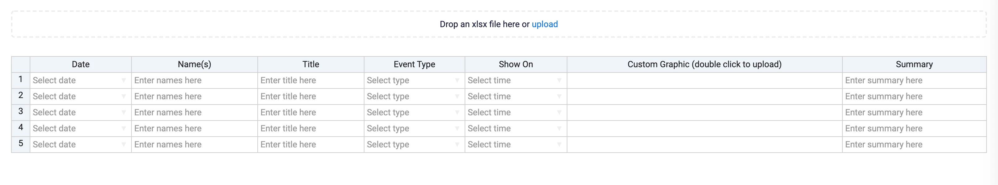 - Summary – Enter a message for the corresponding event. The summary text is displayed beneath the title text on the card display.You may also upload a .xlxs file with event details. The table headers in the file must correspond to the headers in the card editor table shown above i.e. Date, Name(s), Event Type, Show on, Summary. Ensure the Date format is MM/DD/YYYY, while the Event Type and Show on values are exactly the same as displayed in the table drop down for the .xlsx to upload correctly.