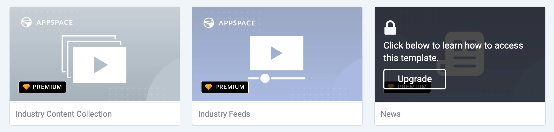 On Appspace accounts that do not have sufficient premium content licenses, the Premium Content card will appear disabled, and when hovered will display an Upgrade link that will direct users on how to access the template.