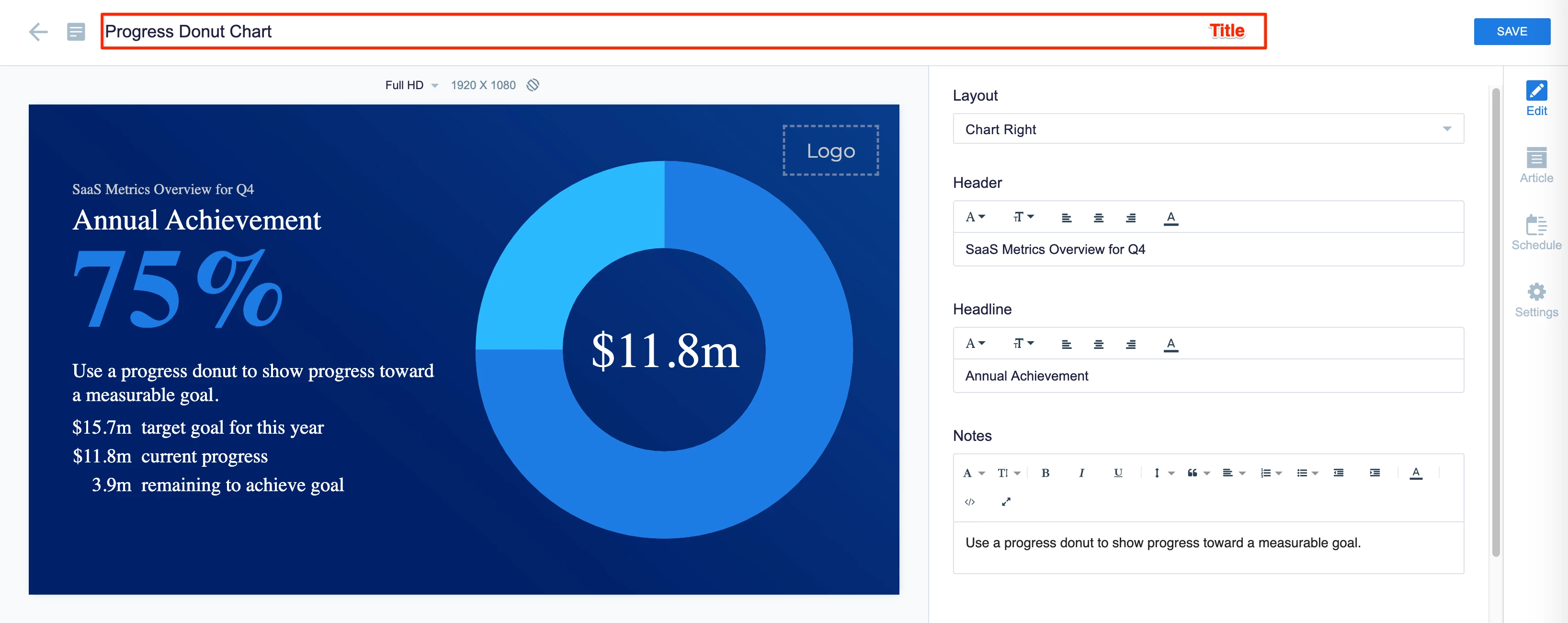 - You may edit the content the same way as it was configured. For detailed instructions on how to do this, please refer to the Create Progress Donut Chart section above.