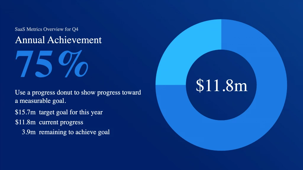 The Progress Donut chart is a Data Visualization card theme, which displays the current progress of a target goal, where the goal may be of monetary, time, or achievement percentage, values. The Progress Donut chart is a simple graphic that is visually powerful by instantly providing detail on how close a goal or a task is to be completed.