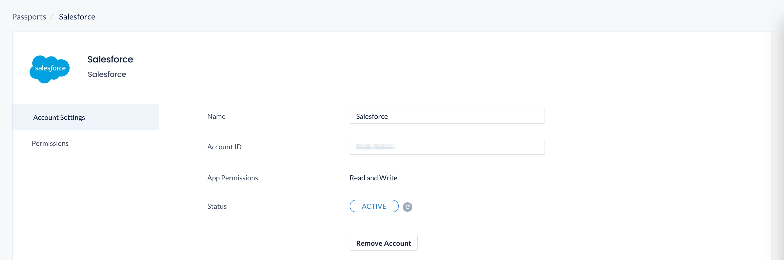 - Select the Salesforce passport, and click CONNECT. Proceed to authenticate the passport, and grant permissions to access the Salesforce account. You may be required to sign in with your Salesforce credentials if you are currently signed out.