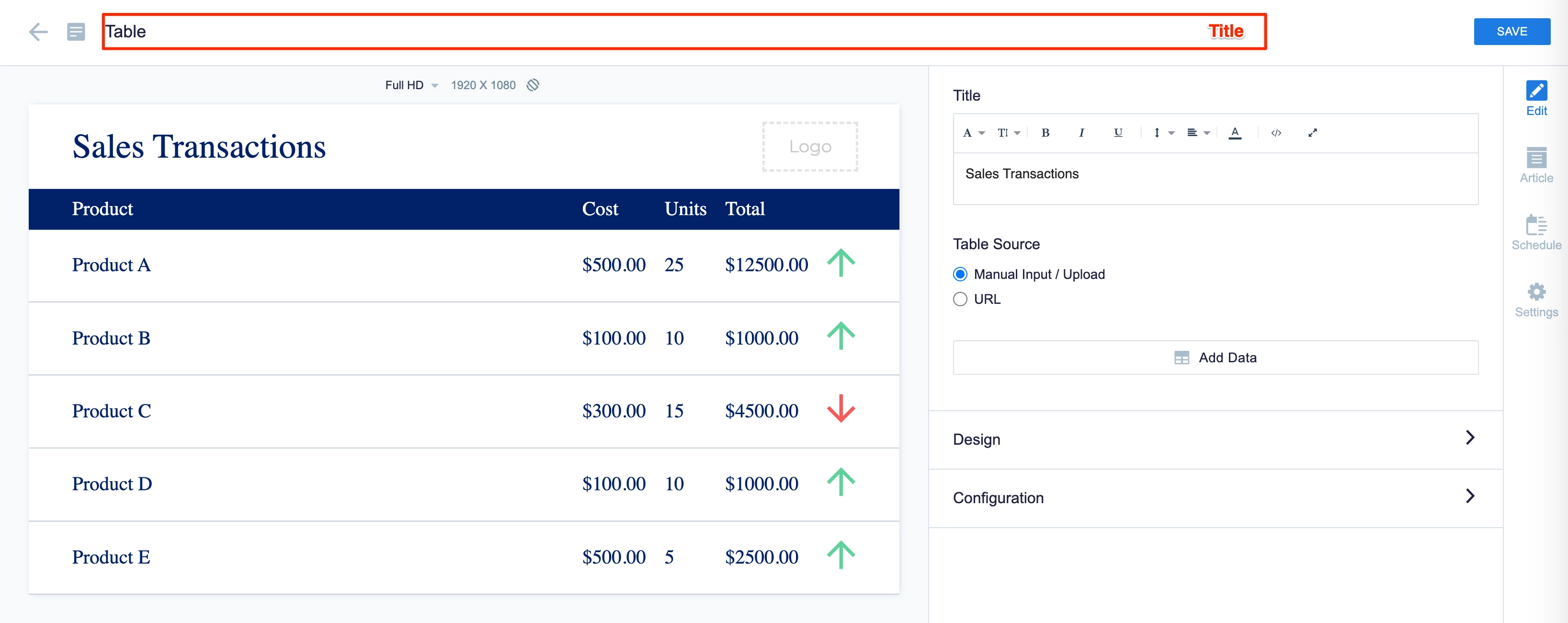 - Enter the Title of the table. Use the Text Editor to customize the text font and style.
