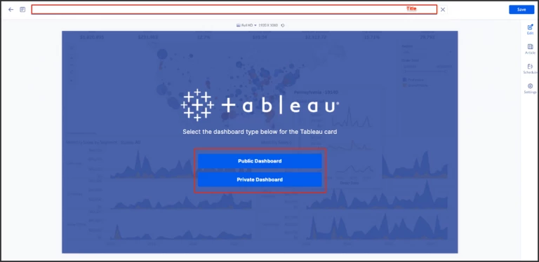In the Card section, you can choose between two options for creating a Tableau card: Public Dashboard and Private Dashboard.