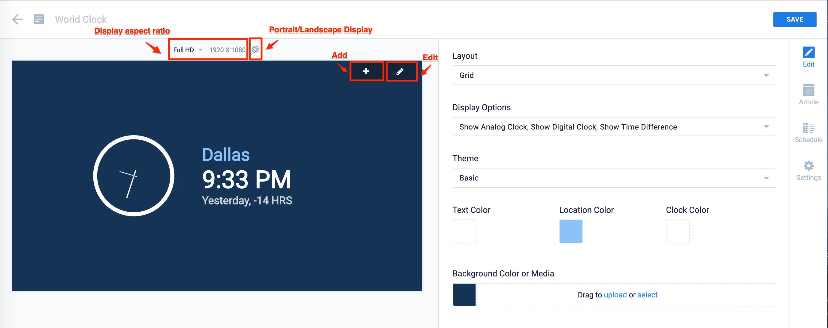 - You may add another city or up to eight different cities by clicking the Add or Edit icon. You can also preview the display settings by changing the aspect ratio or preview portrait/lanscape mode.
