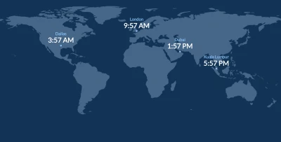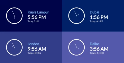 The World Clock card allows businesses to easily display the time for up to eight different cities across the globe, in a map or grid layout. In the Map layout, clocks are displayed relative to the cities located on a map, while in the Grid layout you can choose to display digital clocks, analog clocks, or both.