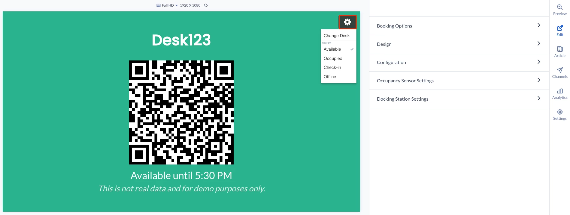 - The Card preview section on the right displays how the Desk Booking card will look like when displayed. You may click the Gear icon to preview the Available, Occupied, Check-in, or Offline status of the card, and Change Desk of the card.