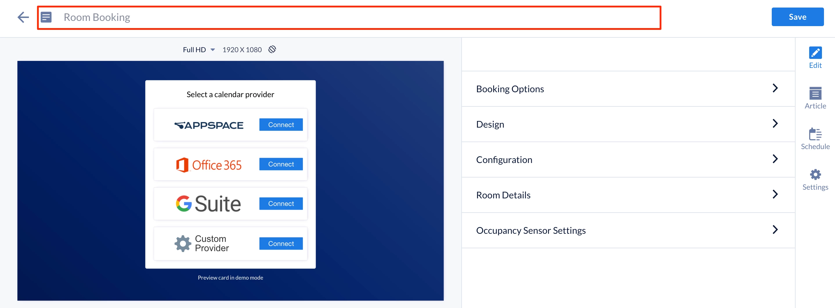 - In the Card preview section, you may authenticate the card by clicking the Connect button for Appspace.If you would like to authenticate later, click the Preview card in demo mode link in the preview window, and proceed to step 7 to configure the booking options and styling of the Room Booking card.