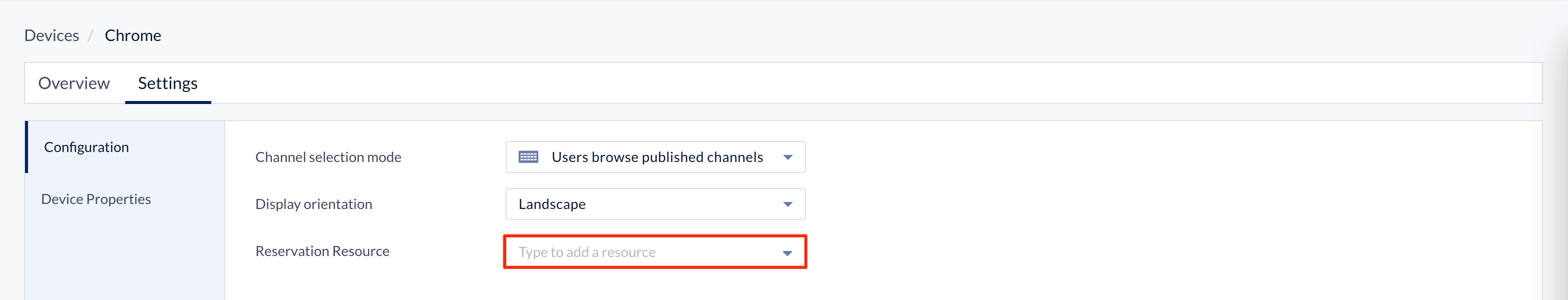 - You must configure each device and ensure it is linked to the desired meeting room (workspace resource), by selecting the resource from the Reservation Resource drop-down menu in the Device Settings tab.
