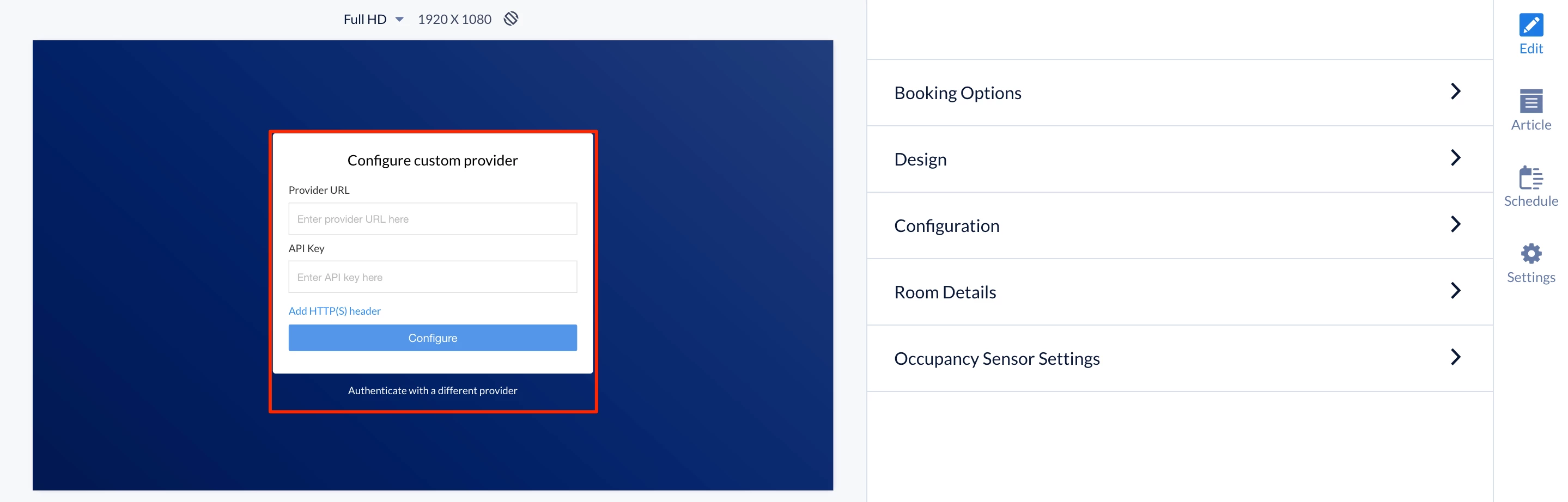- In the Card preview section, you may authenticate the card by clicking the Connect button for Custom Provider.If you would like to authenticate later, click the Preview card in demo mode link in the preview window, and proceed to step 7 to configure the booking options and styling of the Room Booking card.