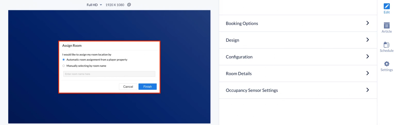 - Support for Occupancy Sensor – Enables integration with 3rd party occupancy sensors connected to an Appspace App device to manage the room status.