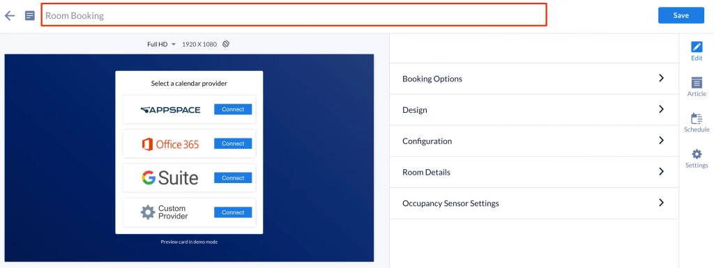 The Room Booking card is an Appspace supported card, which is officially created and periodically updated by Appspace with new templates and features.