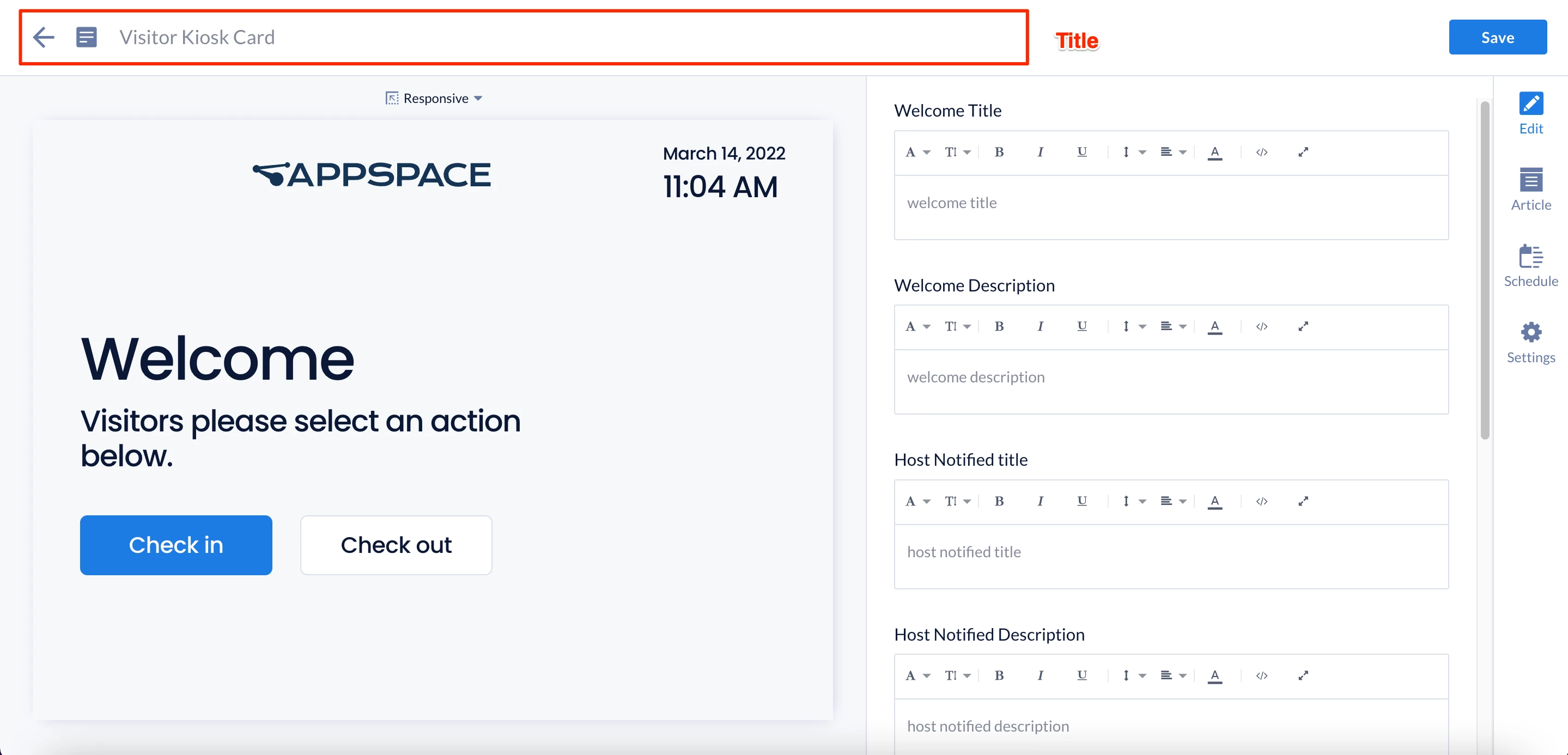 This article provides the instructions to create and configure a Visitor Kiosk card in the Appspace console. The Visitor Kiosk card is used for kiosk check-ins with the Appspace Visitor Management system.