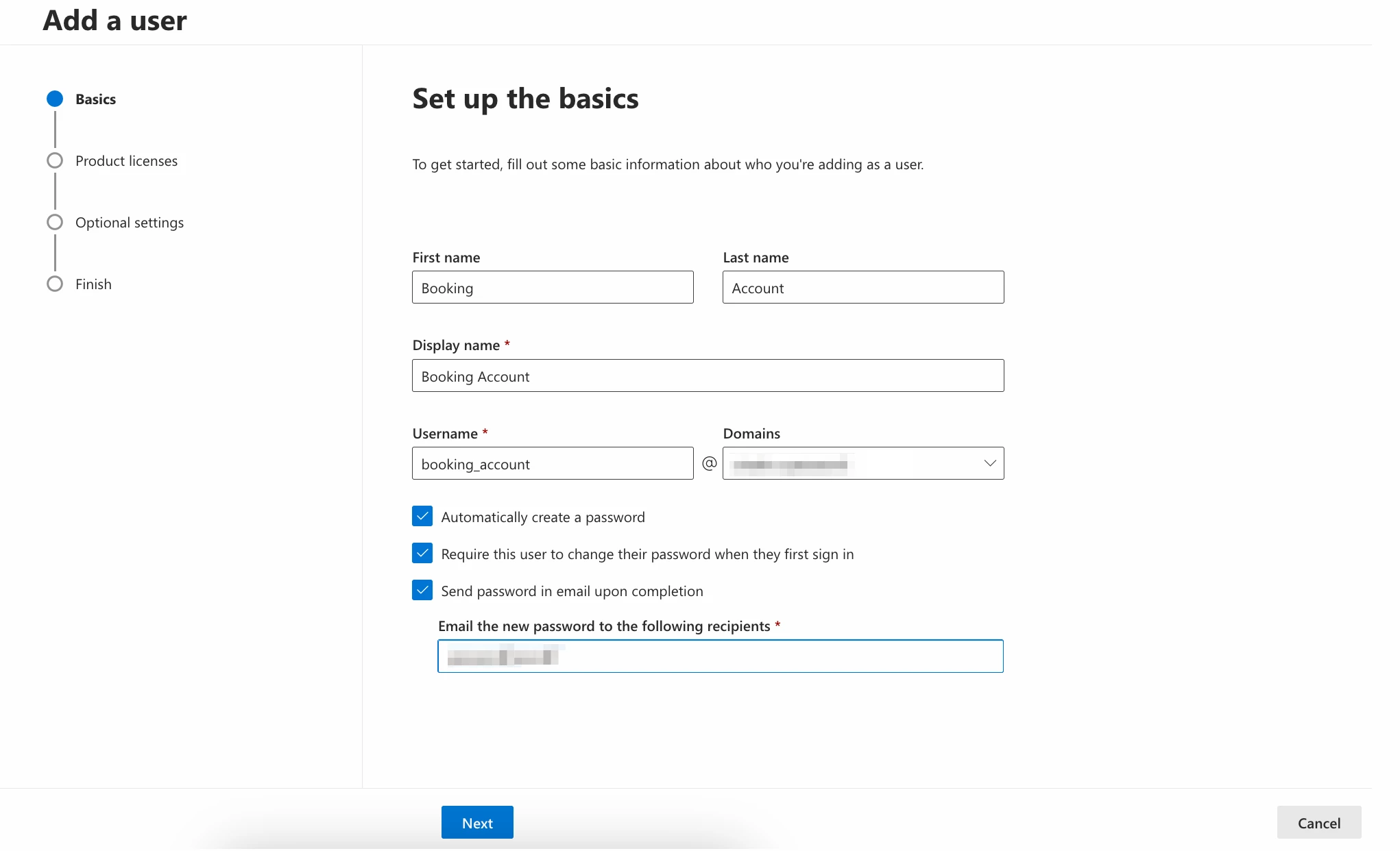 - To create the booking account, follow the instructions in the Add users individually or in bulk to Office 365 article: