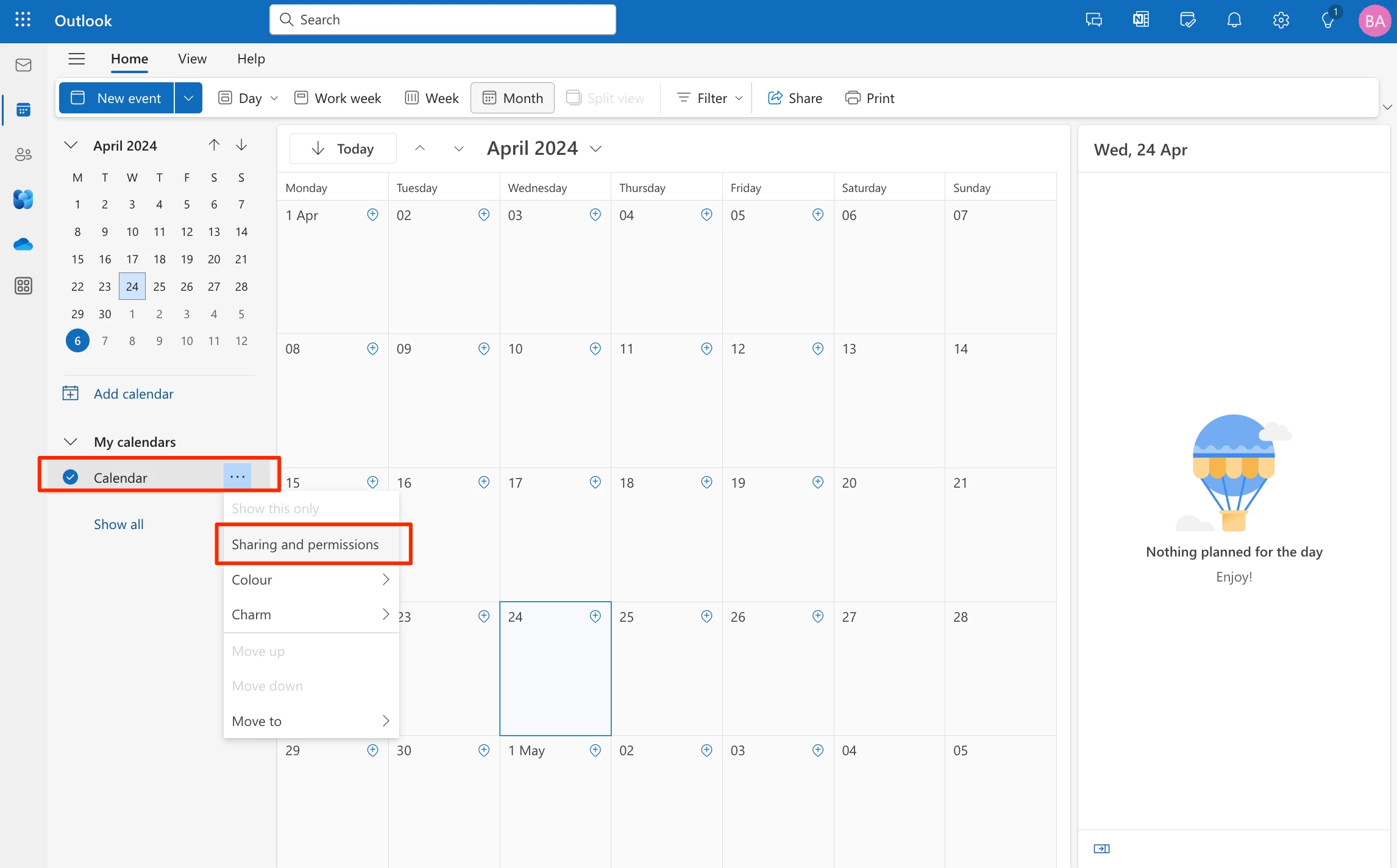 - Navigate to the resource account Calendar, and right-click on Calendar. Select Sharing and permissions.