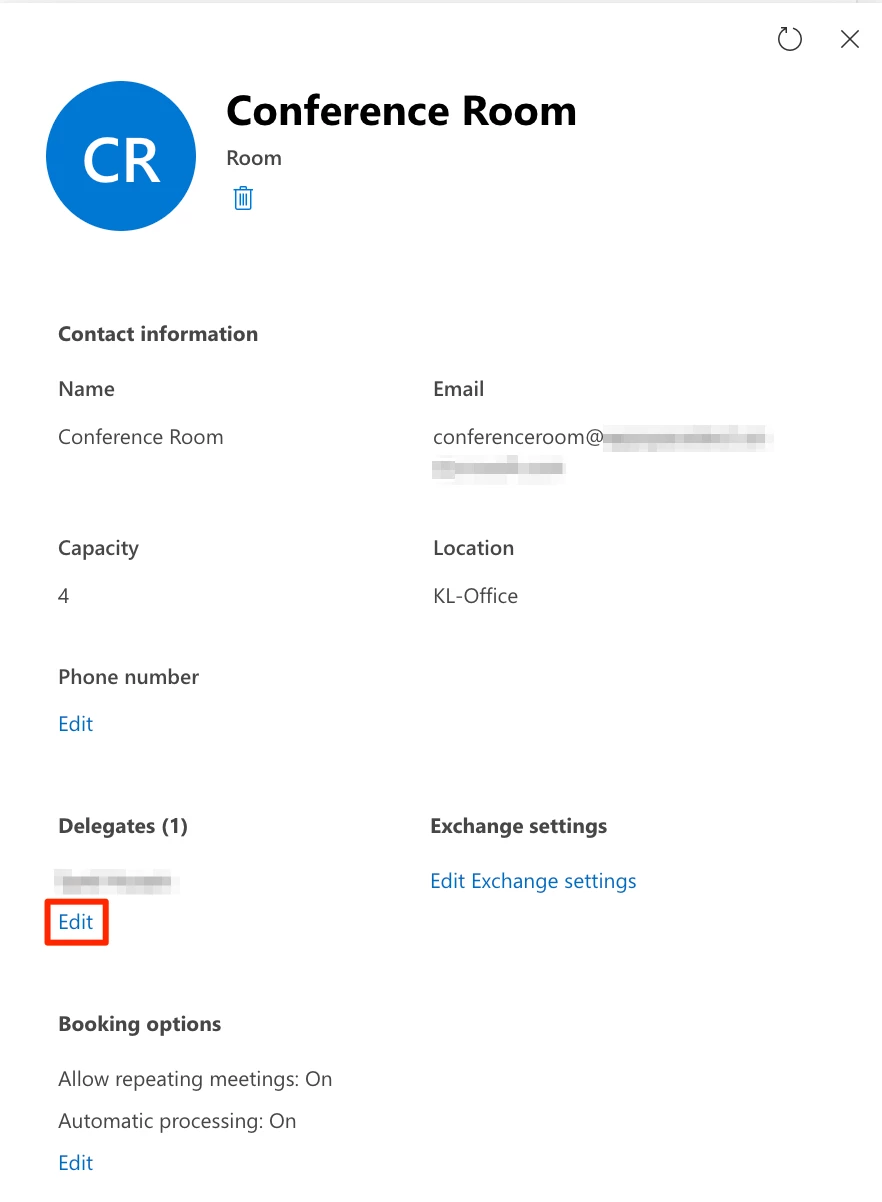- Click the room name, and click Edit in the Delegates section.
