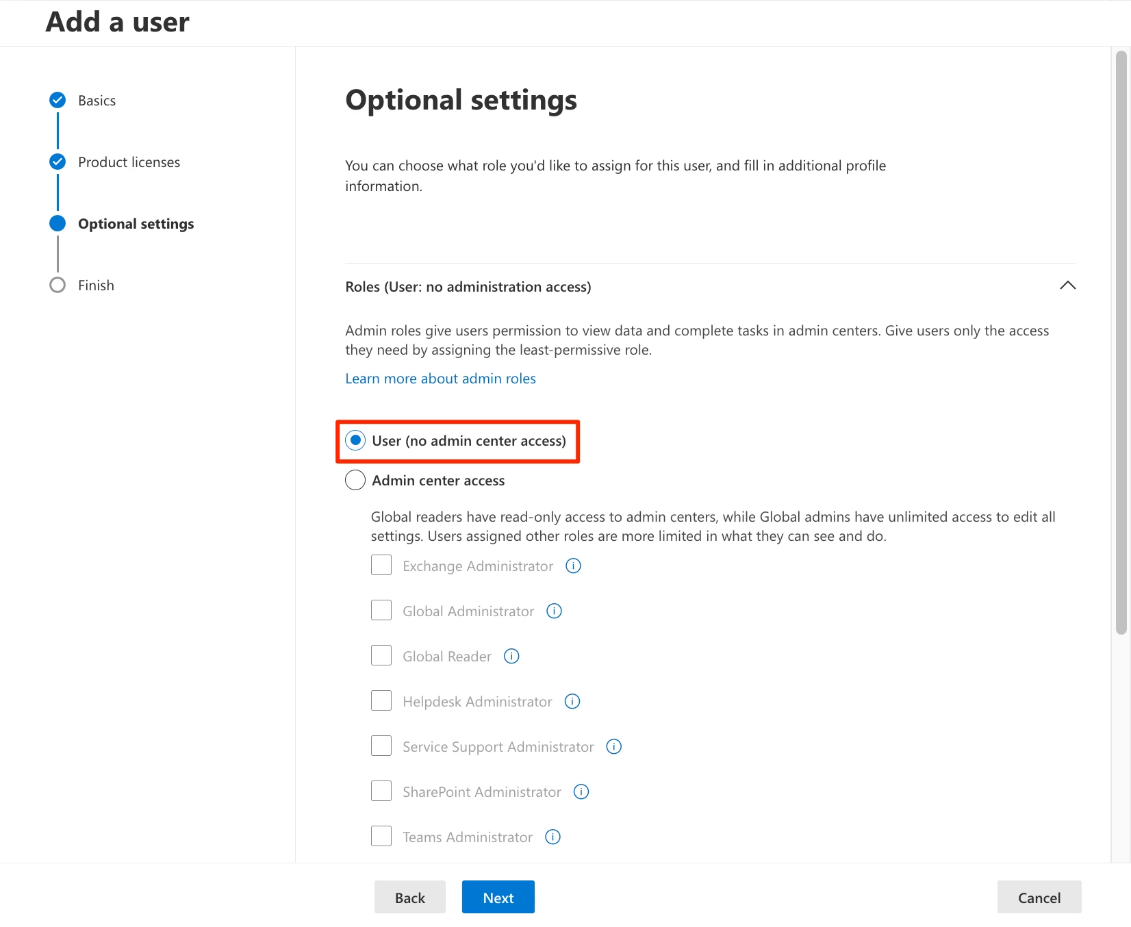 - Roles – Select User (no administrator access)