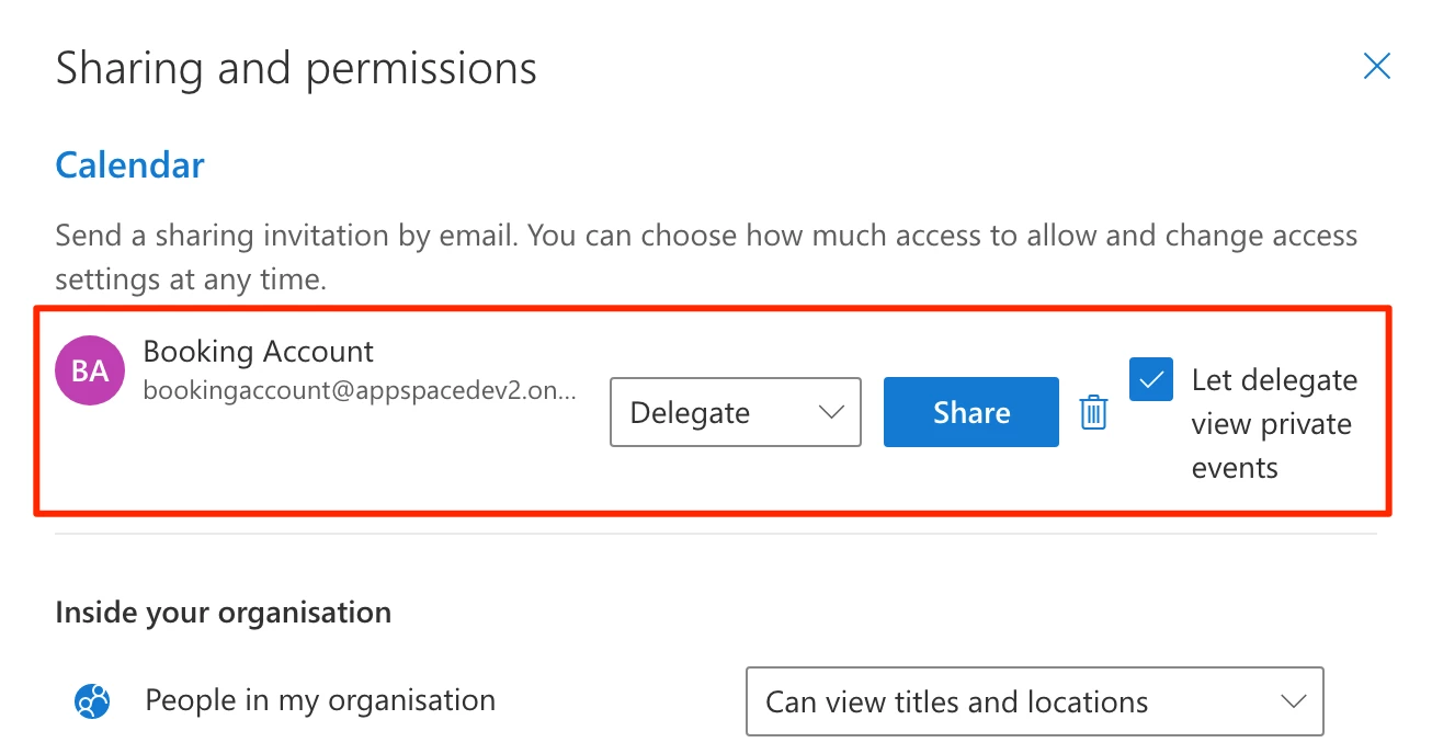 - Enter in the email of the booking account in the Send a sharing invitation in email to share the calendar. Select Delegate from the drop-down list, and check the Let delegate view private events checkbox.