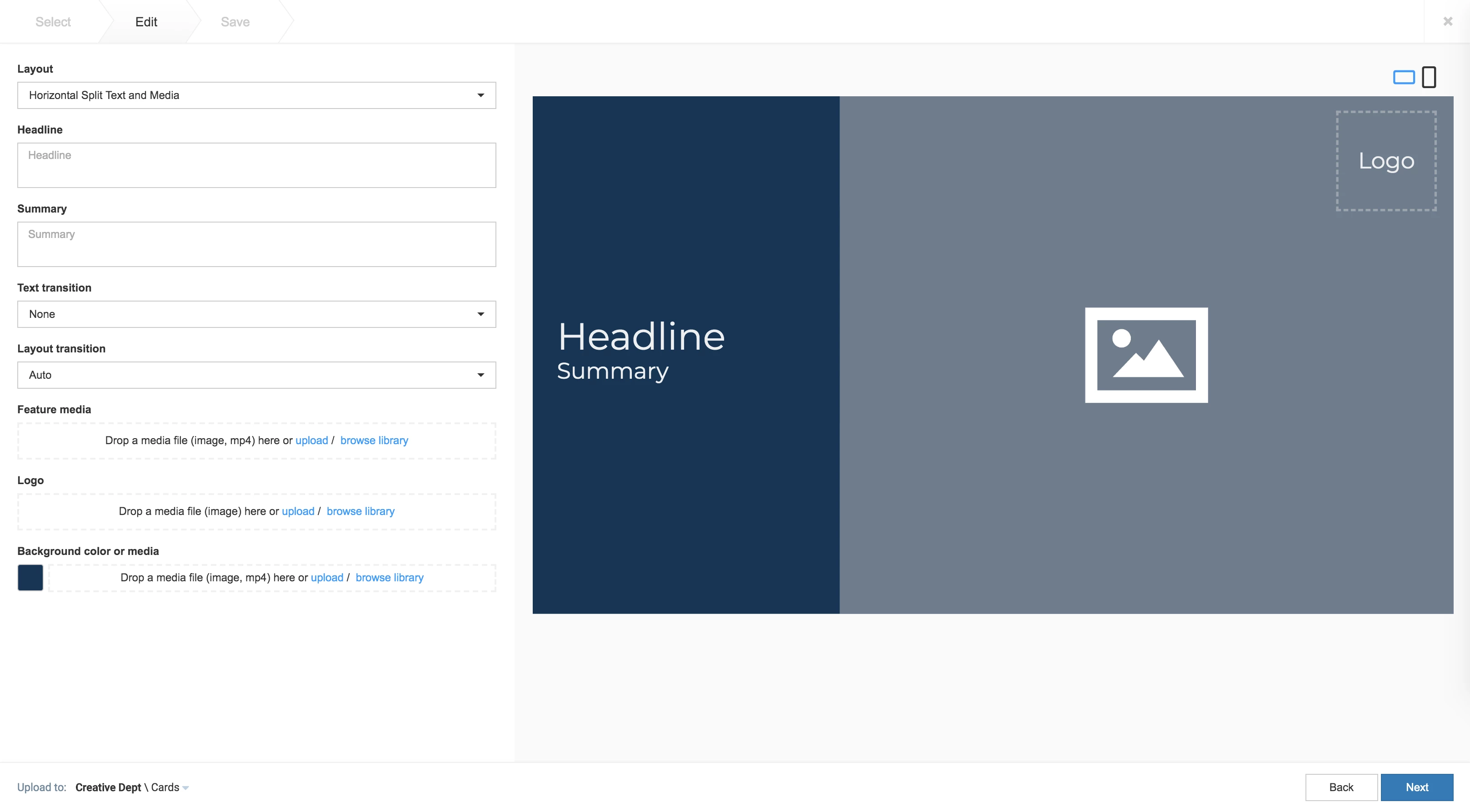 You can add images to the card by browsing the library for existing content. You can also upload, or drag and drop an image directly into the image placeholder, from a folder in your computer. However, you may only upload one image to the image placeholder.