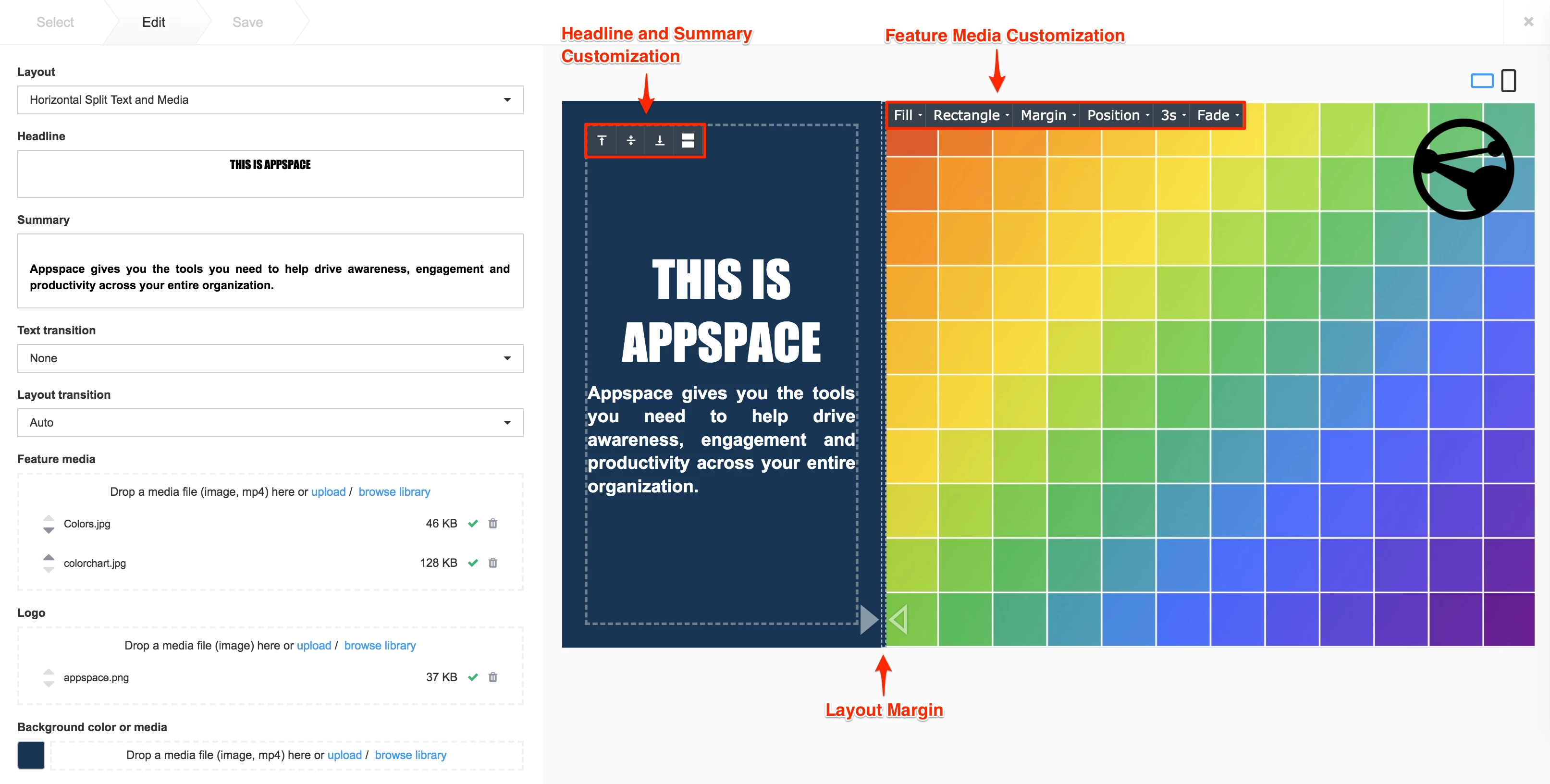 Add a Feature media. Drag-and-drop files directly, select from the Library, or upload content. The Feature media can be customized with the following options: