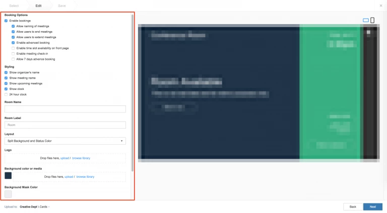The preview pane on the right displays how the Schedule Room card will look like when displayed. You may click the Gear icon to preview the Occupied or Offline status of the card, Change Room, or Log Out from the authenticated card.