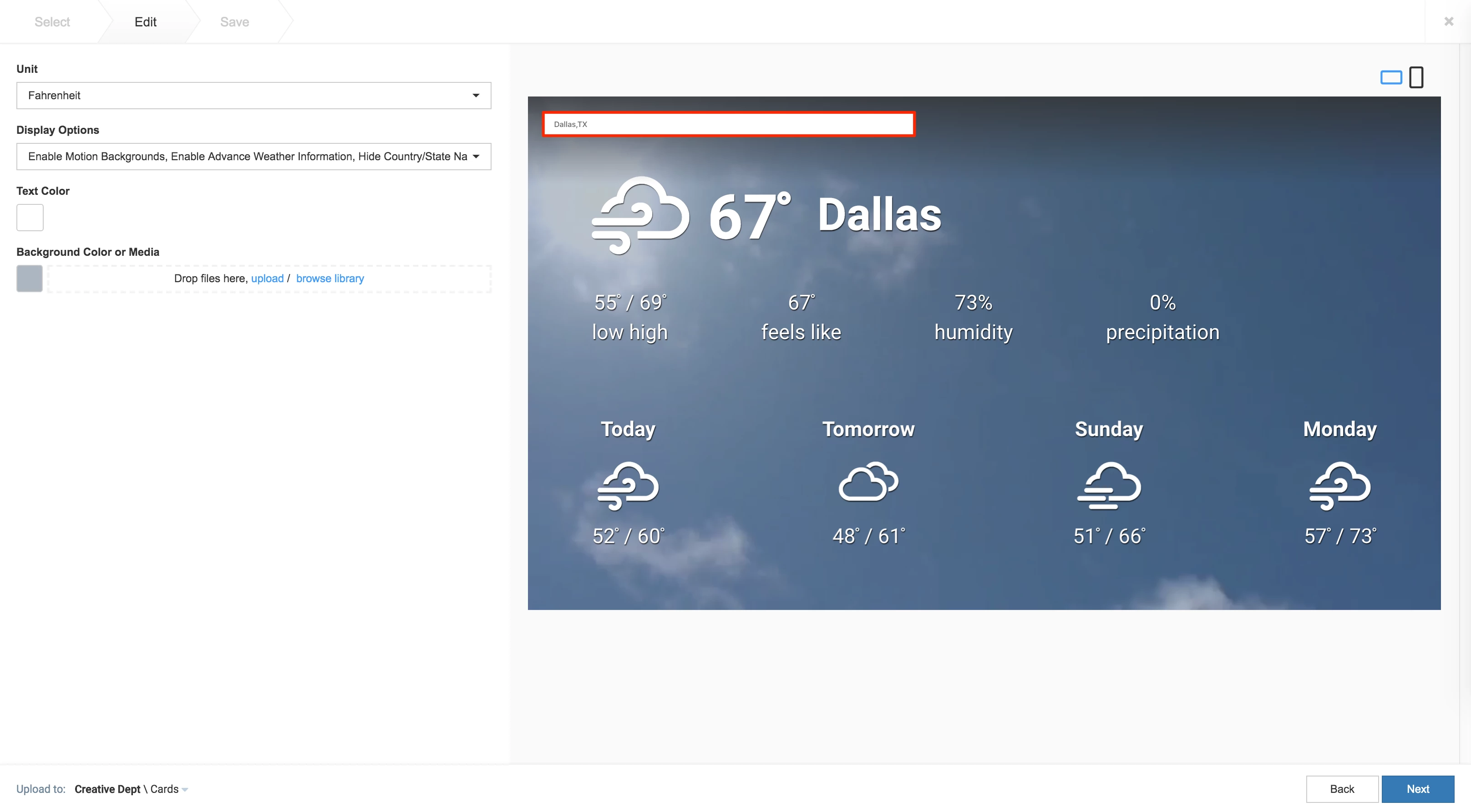 Leaving the location blank allows the card to display the weather of the display device’s current location. This enables users to configure a single Weather card and deploy it to multiple devices on different locations quickly eliminating the need to configure each location manually.