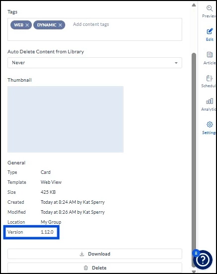 Web View Card versions 1.9 and below will be deprecated on September 30, 2025. As part of ongoing platform maintenance, we are phasing out older Web View Card versions in favor of newer releases that offer a more stable and optimized experience. This isn't a change to how the card works — it's the same Web View Card, just streamlined around the latest versions. On the deprecation date, the endpoint supporting these older versions will be permanently shut down. Any instances of the deprecated card, whether actively published or saved in your content library, will be automatically removed. We recommend updating to version 1.10 or above ahead of this date to avoid any disruption.