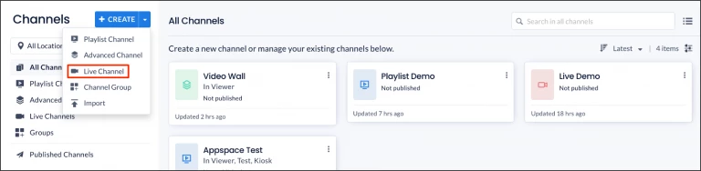 - Click the +CREATE button, select Live Channel and enter in a name for the live channel.