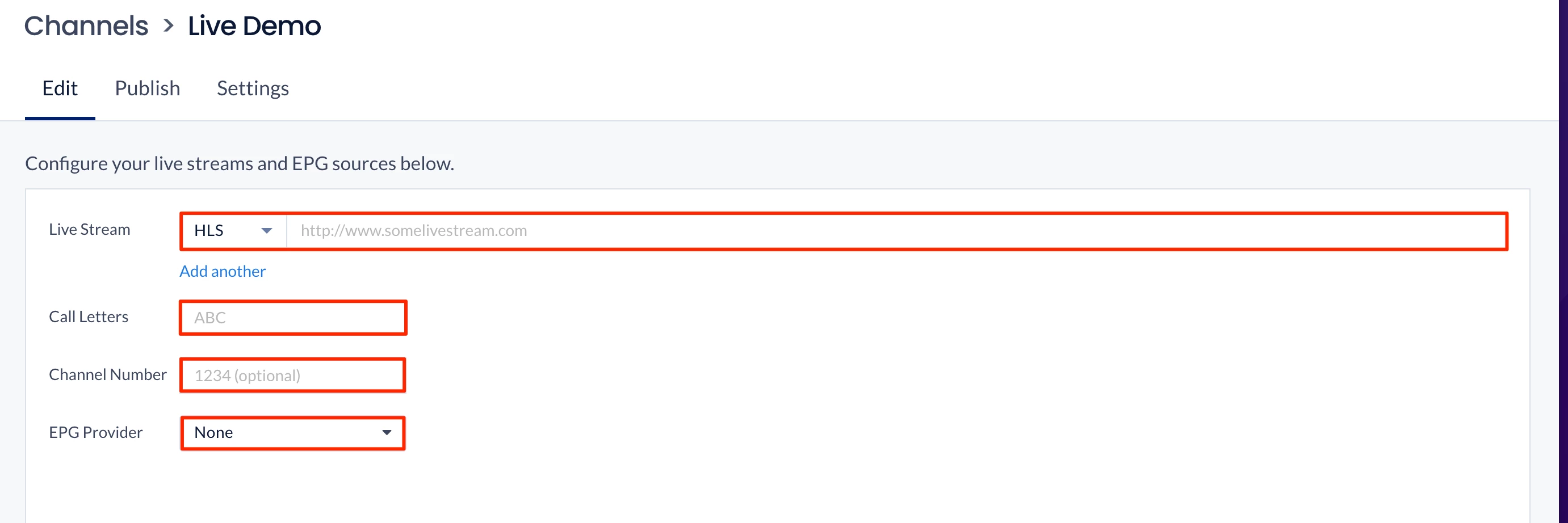 - In the Edit tab, configure the Live Stream URL stream, and enter in the Call Letters and Channel Number for the live stream.
