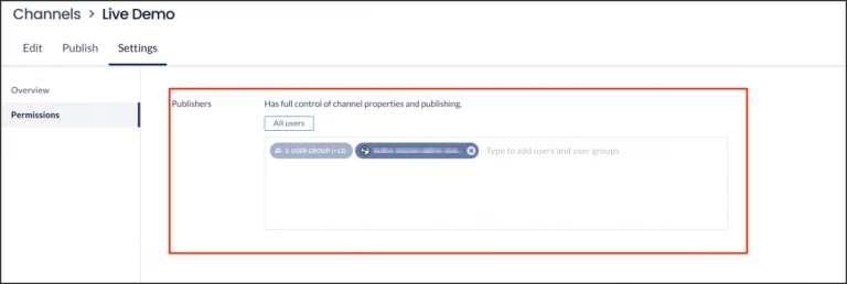 - Click the Publish tab to determine the Devices or Users that can access this channel by selecting the devices or users.