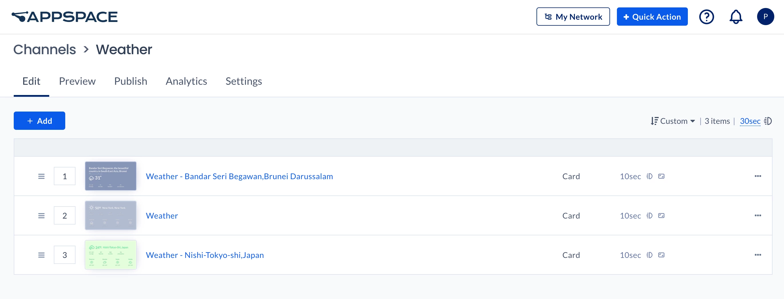 You can build a channel playlist using helpful, easy-to-use templates called Cards. Playlist channels with cards offer a dynamic and robust messaging combination. For more information on how to use cards, refer to the Introduction to Cards article and Supported Appspace Cards article.