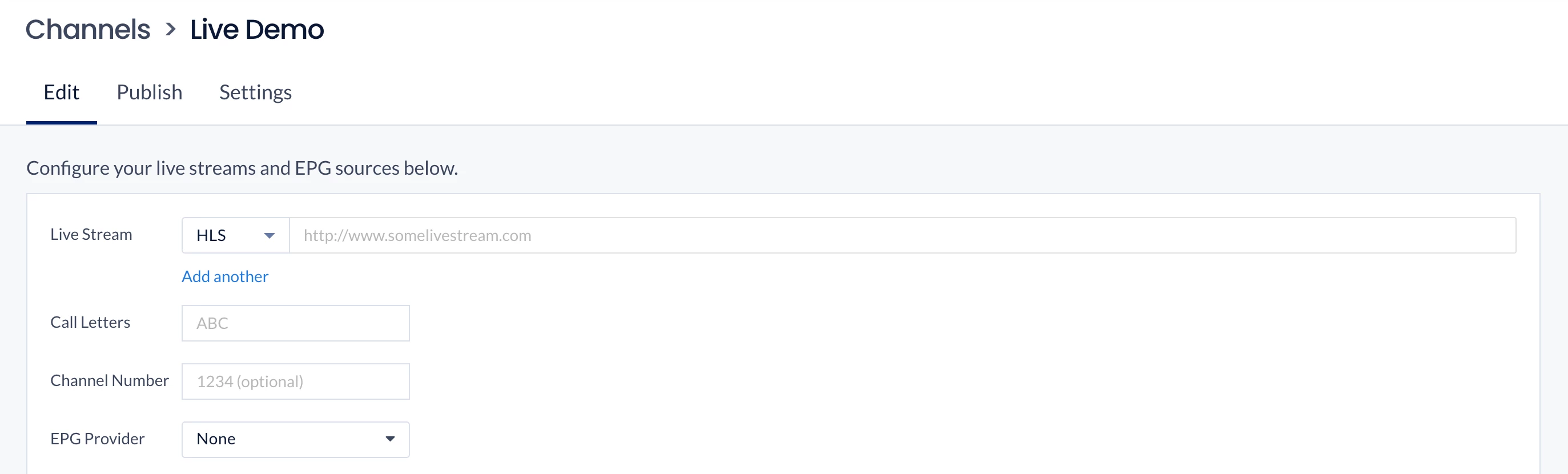 - Live channel – allows you to build a channel with live video feeds from broadcast TV, webcams, and other video sources, using urls and the Electronic Programming Guide (EPG) provider settings. You can use the live channel to publish different types of live video feeds across several devices.