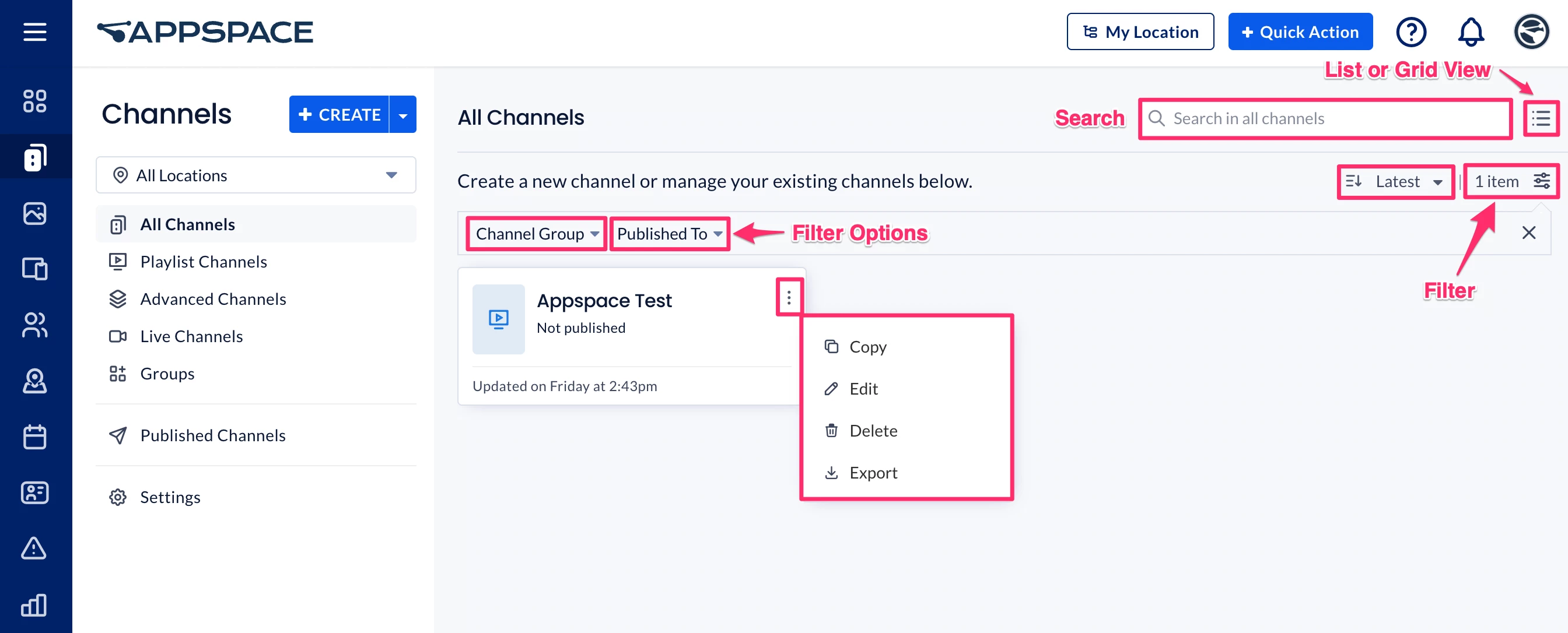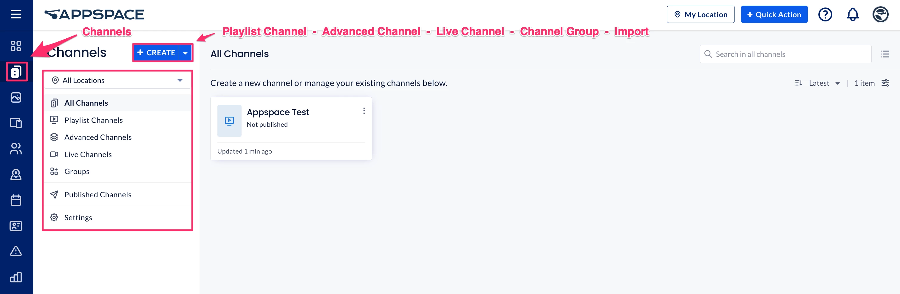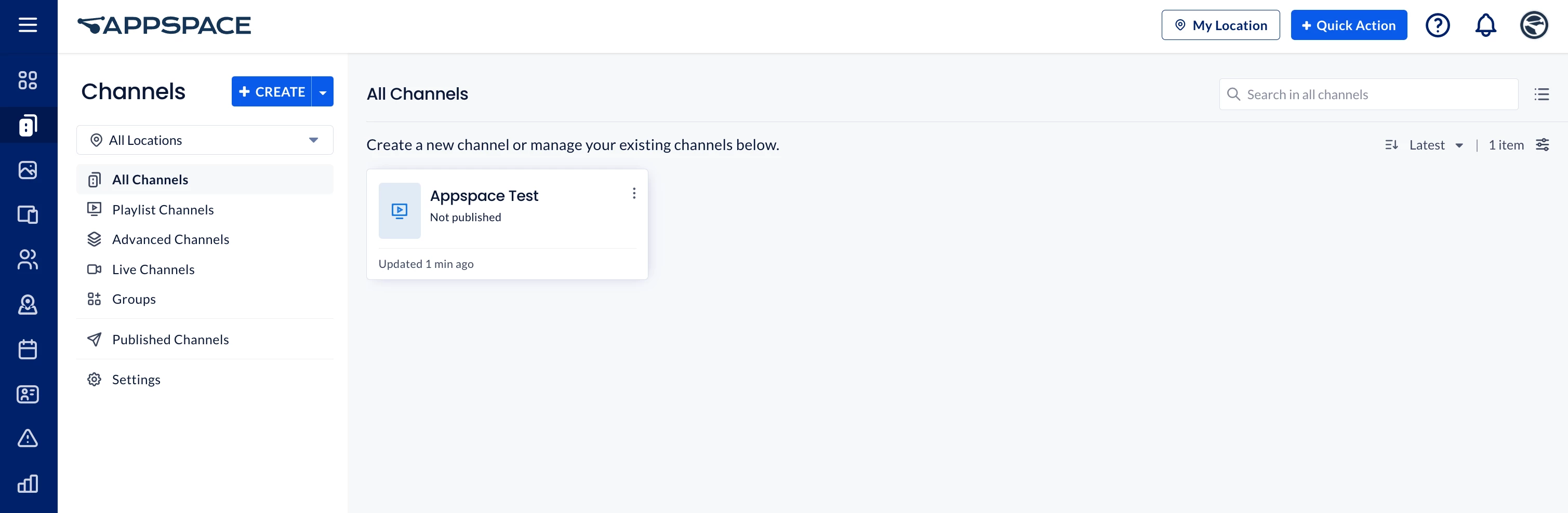 - The Channels dashboard is accessed via the Appspace menu (☰) icon on the console sidebar. Here, you’ll be able to view, create, and manage channels within the Appspace console. Appspace has three channel types: