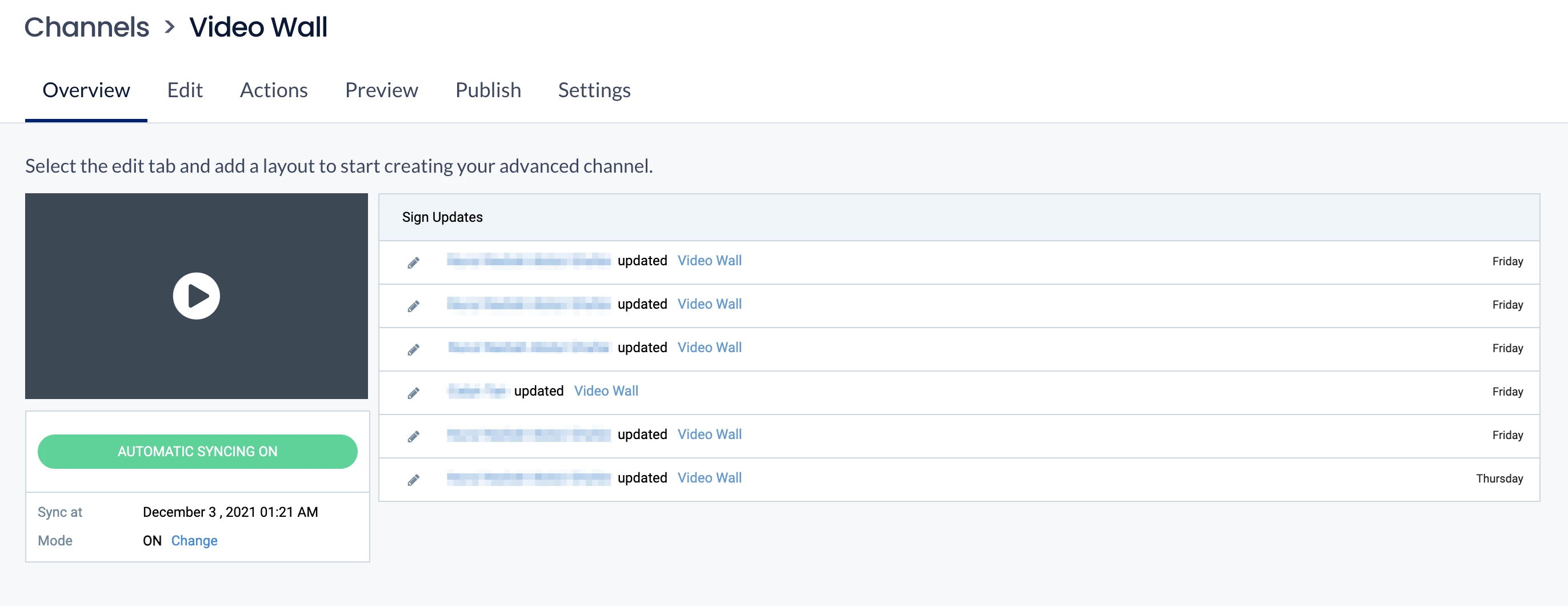 - Overview – provides an overview of updates made to this channel. Also allows you to turn on automatic sync.