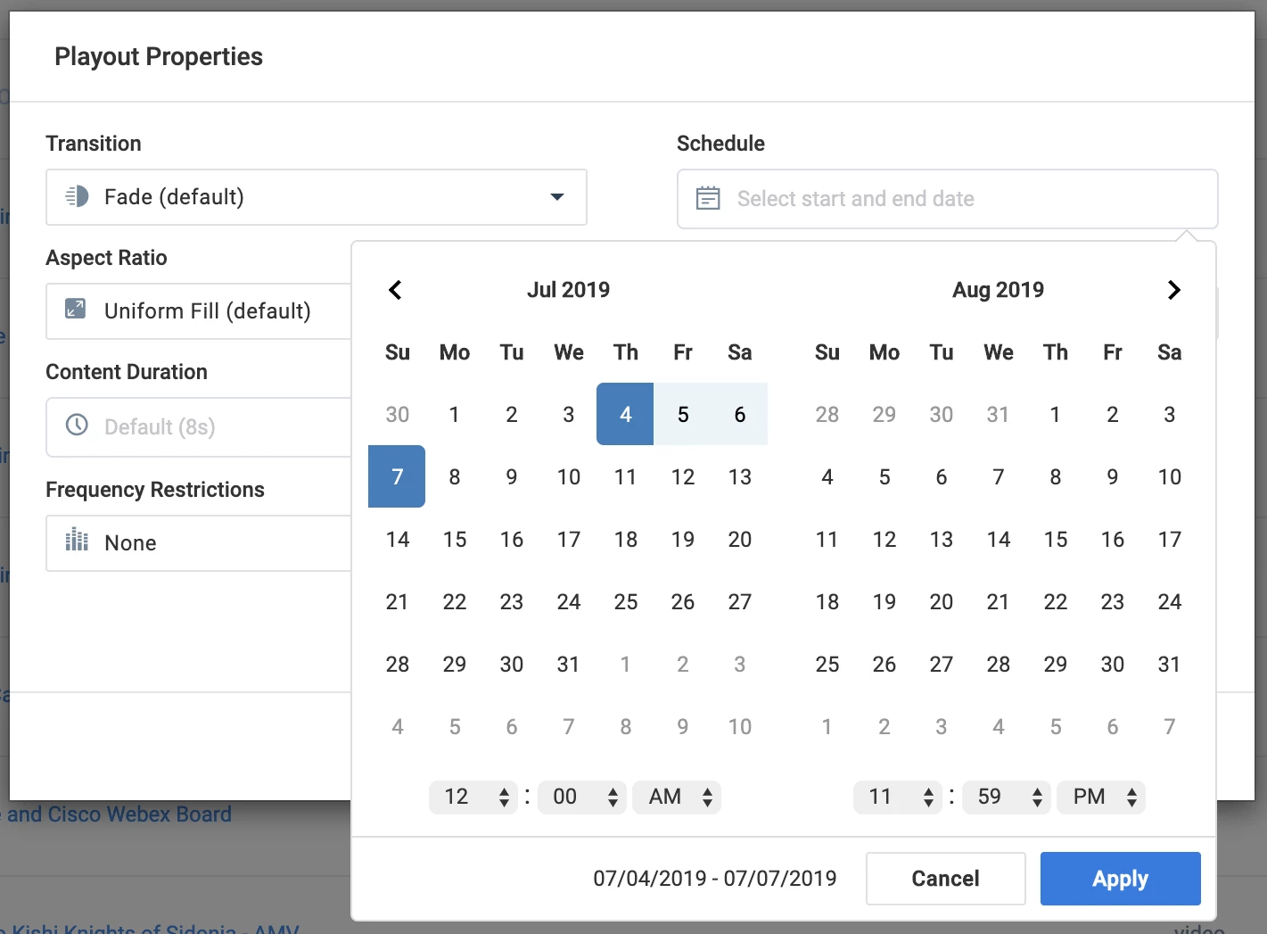 You can set a schedule for specific content in a channel to play during a certain time, for example during a marketing or promotional period. Define the date, time, and duration for which specific content is played in a channel. The scheduled content will automatically play in the channel only during that time.