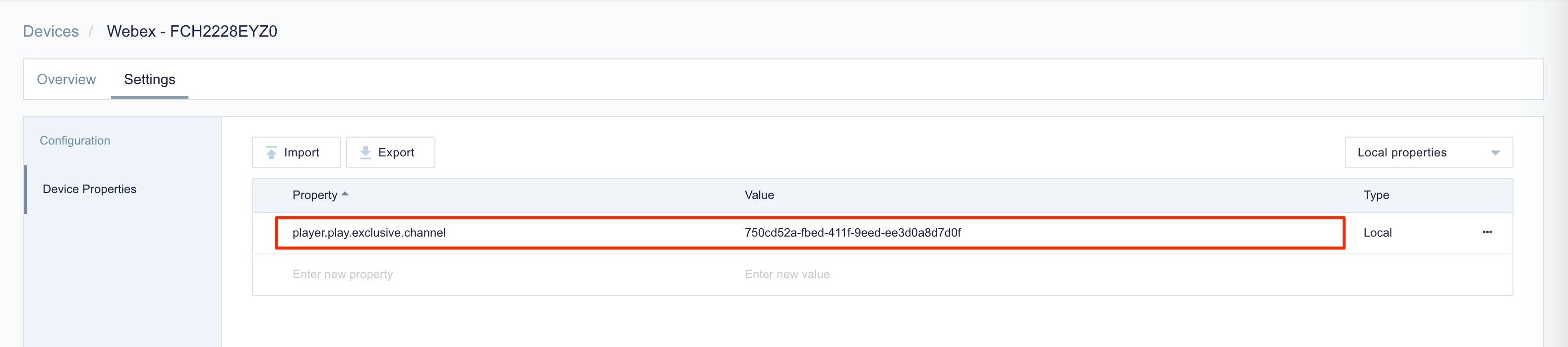 - Example: player.play.exclusive.channel = 750cd52a-fbed-411f-9eed-eed3-ee3d0a8d7d0f