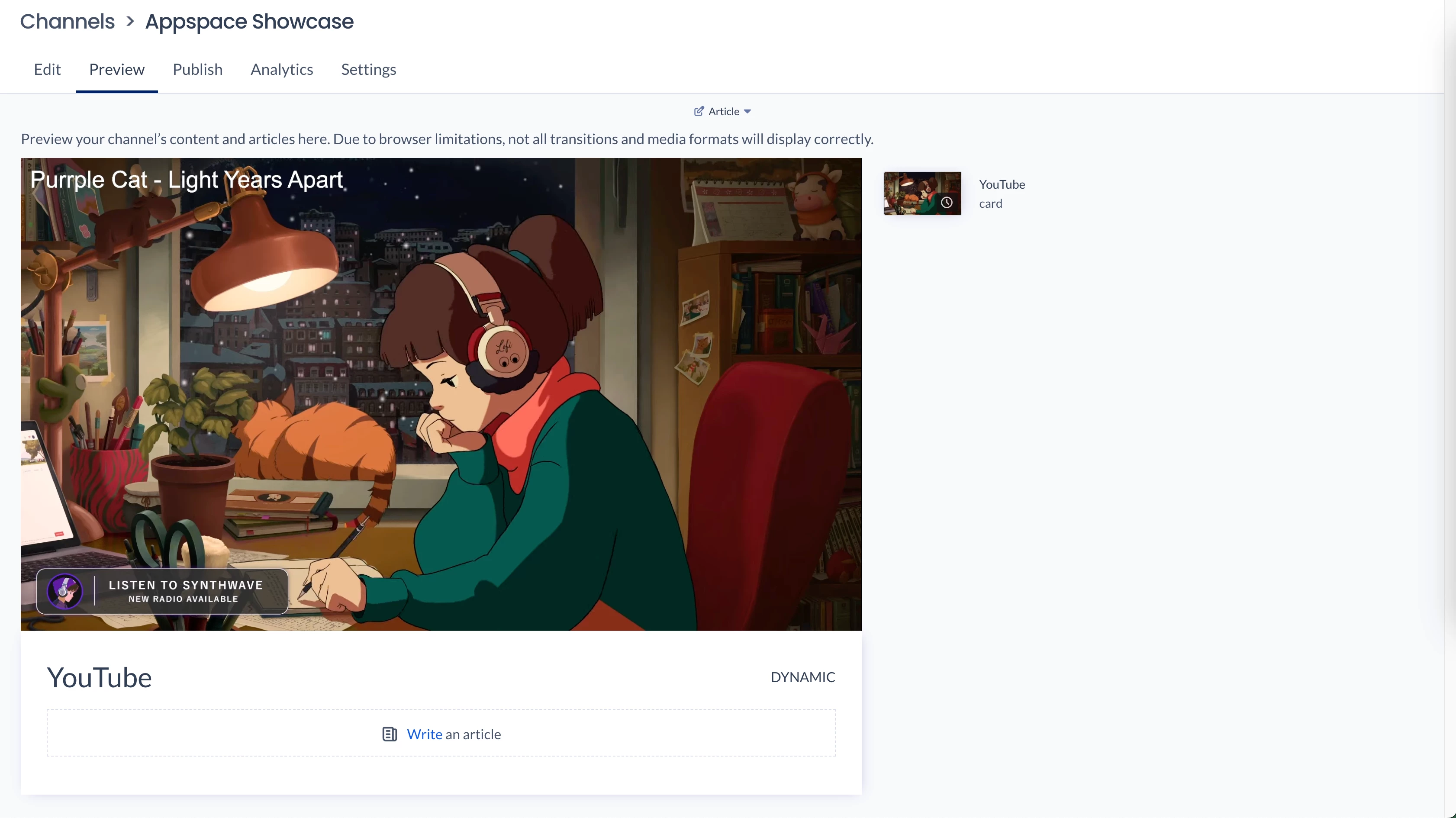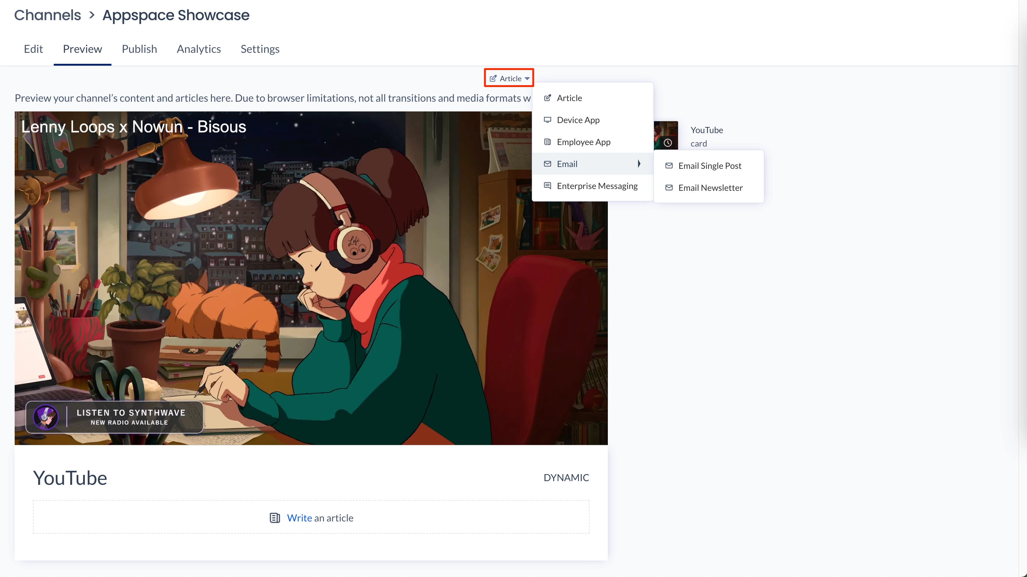 - Click Article and select the display format you wish to preview your playlist channel.