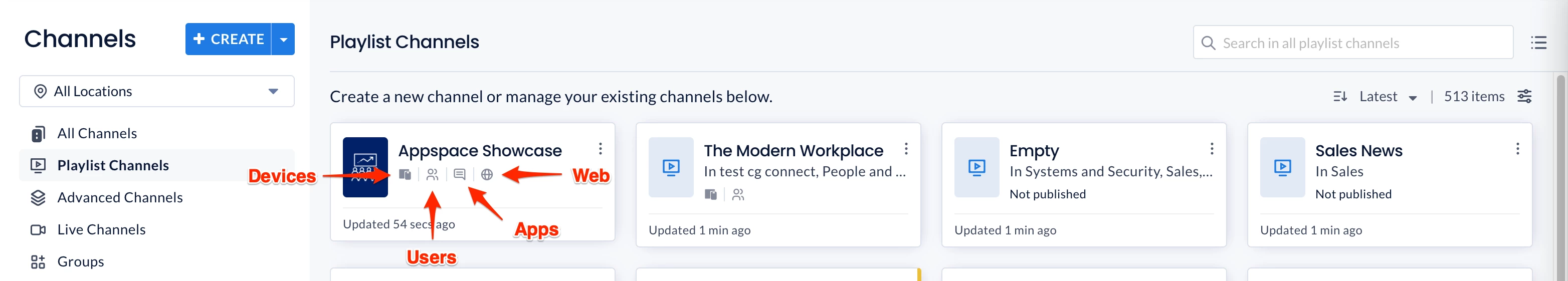 - Click Channels from the ☰ Appspace menu, and click the + CREATE button.