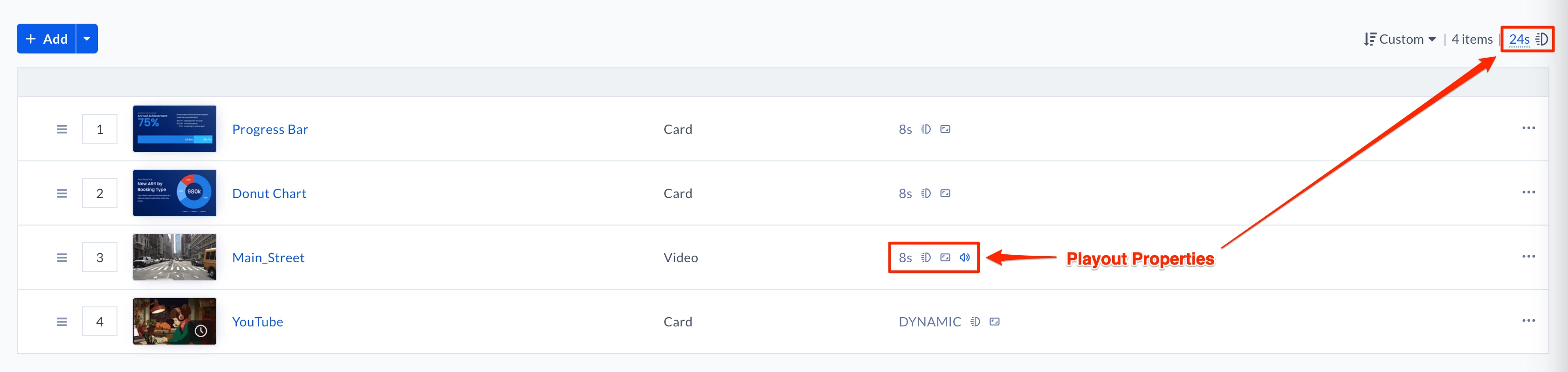 - Once the content(s) has been added to the playlist channel, you have the option to configure the following playout properties for the added content, by clicking the Playout Properties icon: