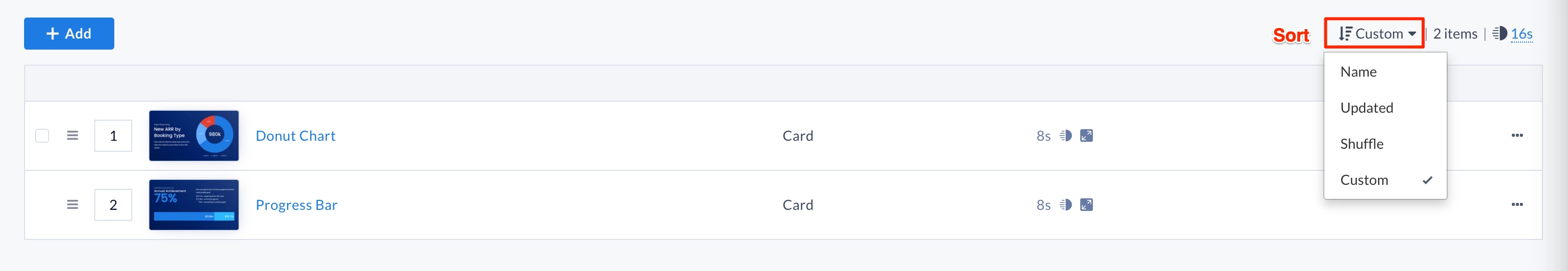 - Custom (default) – Customize the content order by moving it up or down within the playlist channel.